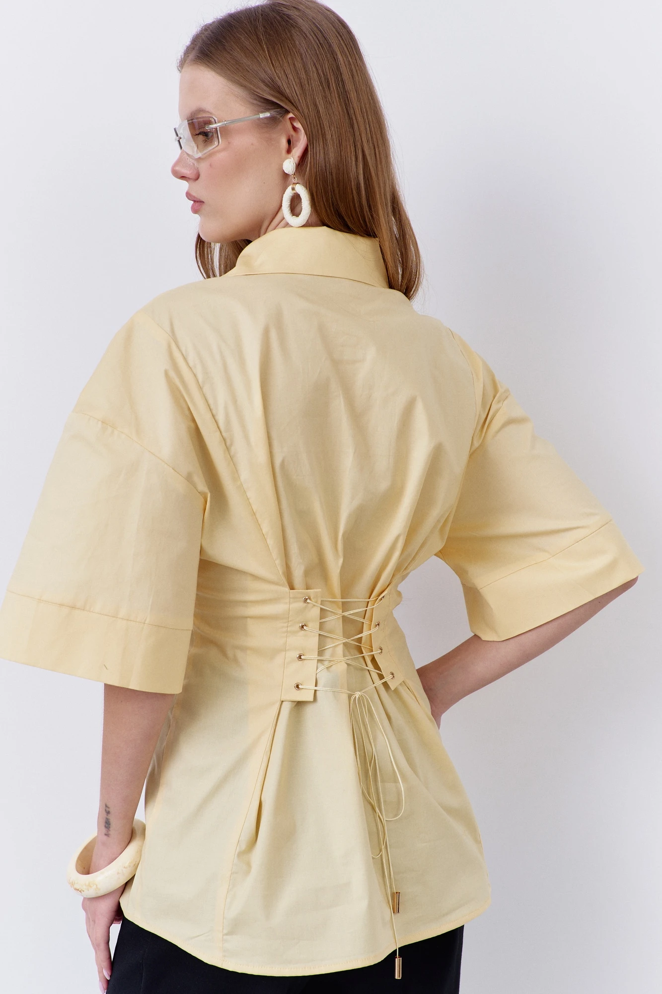 Блузка приталенного силуэта с декоративной шнуровкой по переду и спинке. Характеристики: выполнена из блузочной ткани в желтом цвете, центральная застежка на петли и пуговицы, по переду и спинке декоративная шнуровка, воротник рубашечного типа, спущенное плечо.