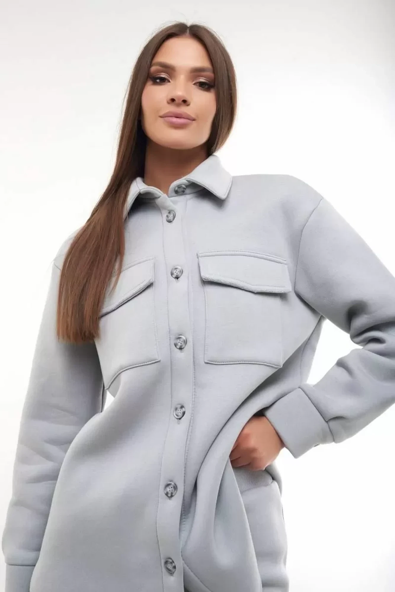 Современная женская рубашка покроя оверсайз, изготовлена из футера с начесом. Рубашка с классическим рубашечным воротником с застежкой на петли и пуговицы. На передах накладные карманы с клапанами. Спинка с кокеткой и двумя складками из-под нее. Рукава длинные, имеют манжеты с застежкой на петлю и пуговицу. Низ изделия и клапаны имеют не обработанный край, но укреплен специальной строчкой.