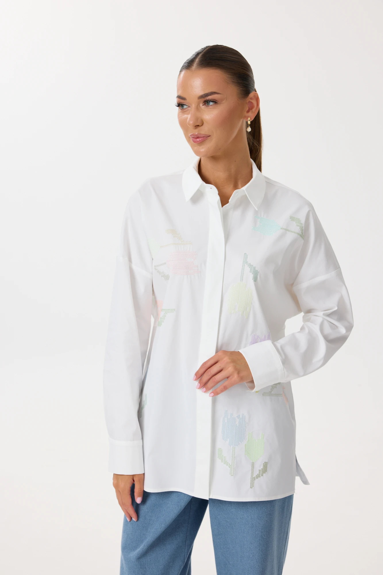 Блузка женская прямого силуэта. Перед с центральной застежкой на петли и пуговицы, декорирован авторской вышивкой. Спинка с кокеткой. Плечо спущено. Рукав длинный одношовный, по низу со складками. Низ рукава обработан притачной манжетой, застегивающейся на петли и пуговицы. В боковых швах обработаны разрезы. Горловина обработана воротником рубашечного типа с отрезной стойкой. Декоративные элементы и фурнитура могут отличаться от заявленных на фото. Цвет материала может отличаться по тону в зависимости от настроек вашего монитора!