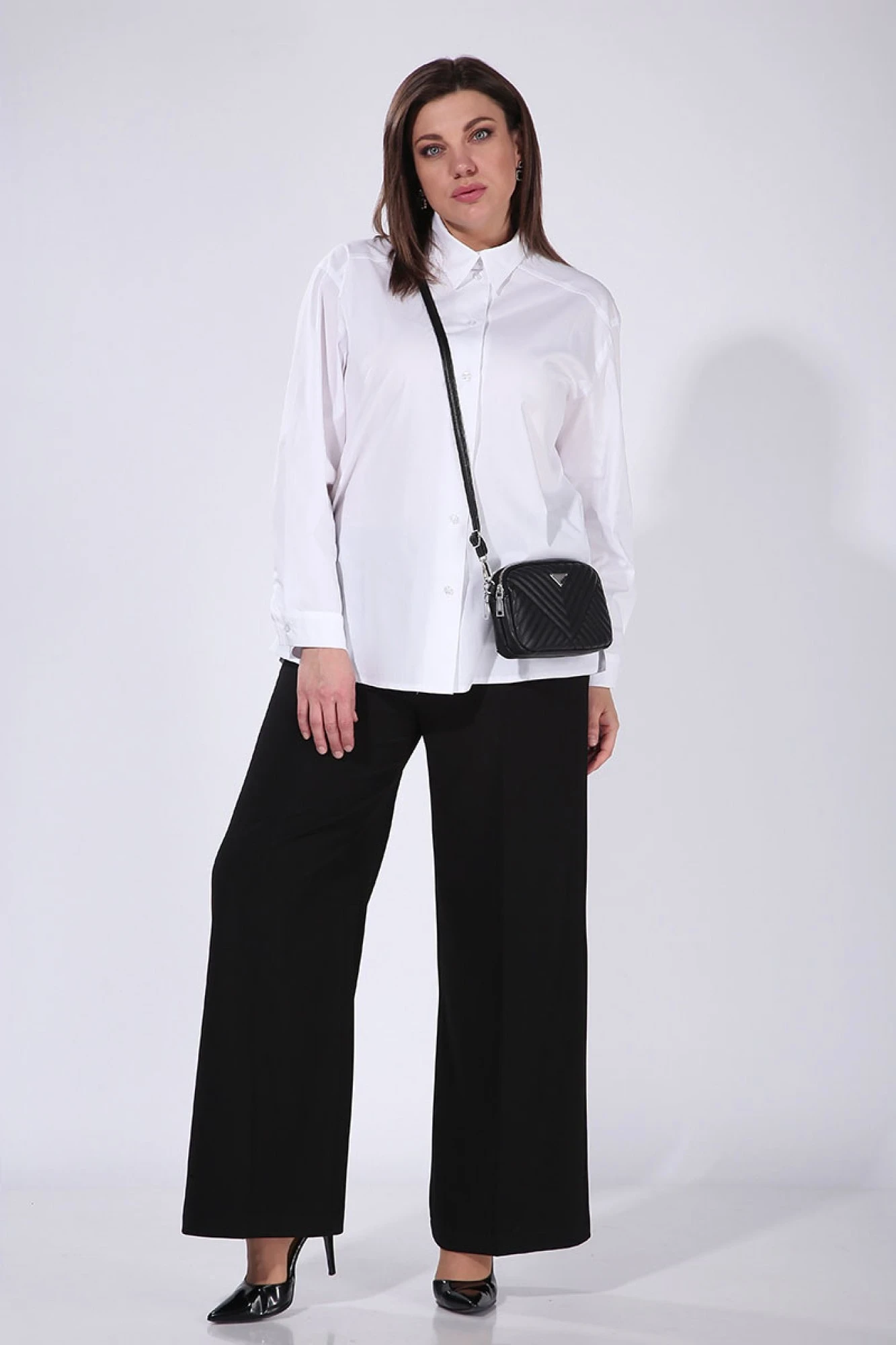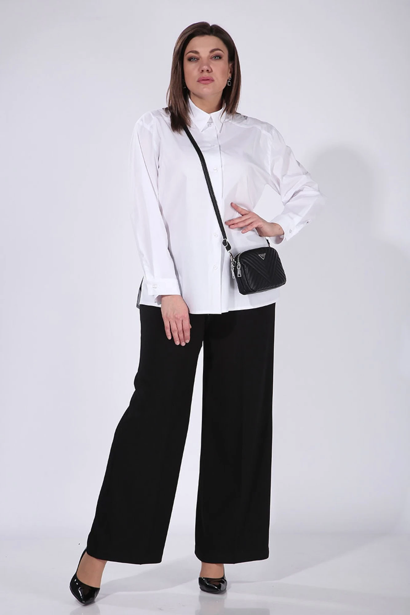 Блуза рубашечного кроя, воротник на стойке, рукав втачной, длинный, на манжете. Застежка петли, пуговицы. В боковых швах разрезы.