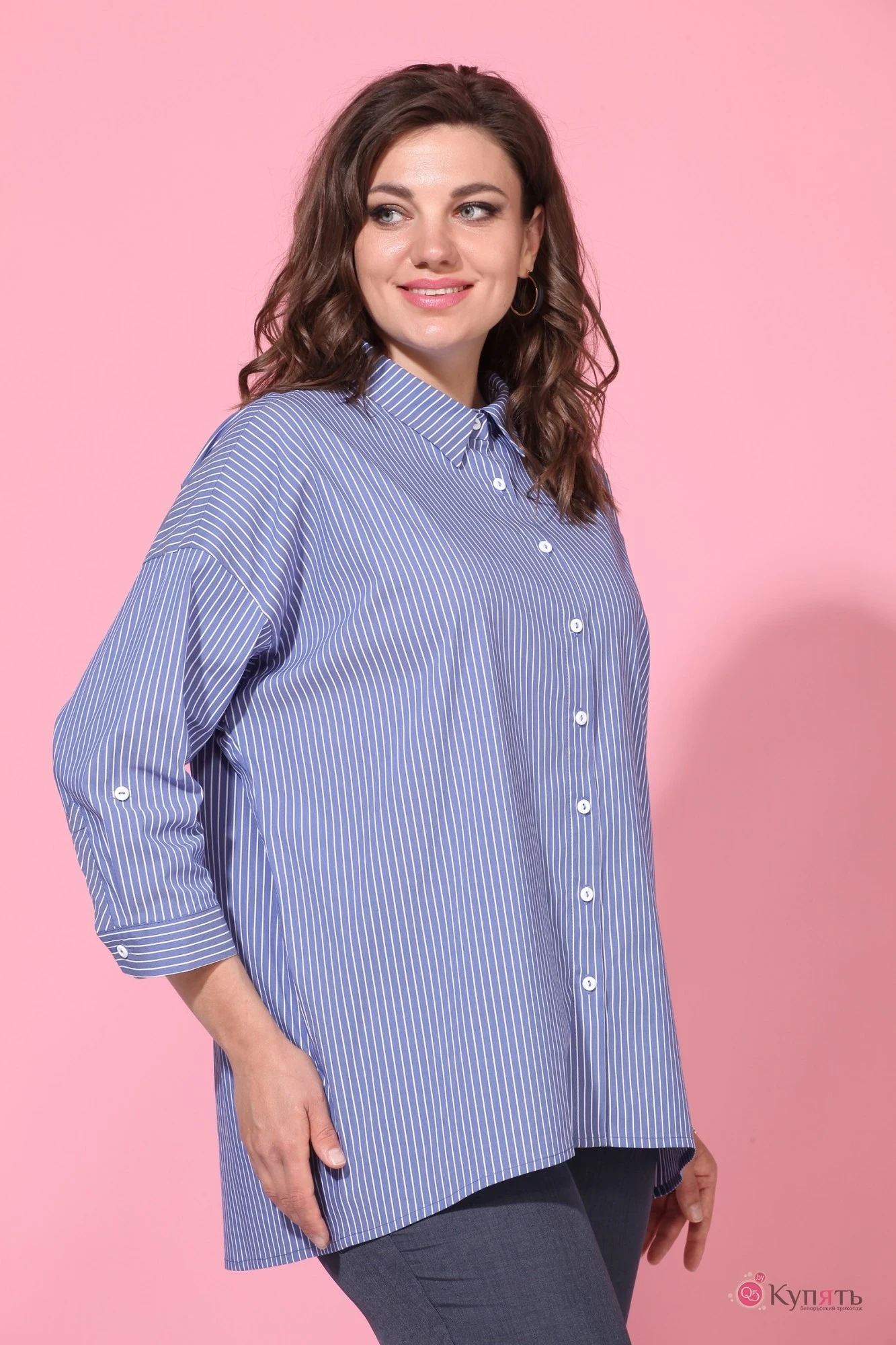 Блуза прямого силуэта с круглым вырезом горловины, обработанной стойкой и стояче-отложным воротником. Перед с центральной застежкой. Срезы под застежку обработаны цельнокроенными планками с петлями-пуговицами. Низ переда фигурный. Блуза со спущенными плечевыми швами. Рукава втачные, одношовные. По низу рукавов заложены складки, обработаны разрезы и манжеты. Манжеты с застежкой на петли-пуговицы. На рукавах обработаны хлястики с петлей-пуговицей. Размеры 42-46: длина изделия 75 см, длина рукава изделия 52 см. Размеры 48-52: длина изделия 76 см, длина рукава изделия 53 см.