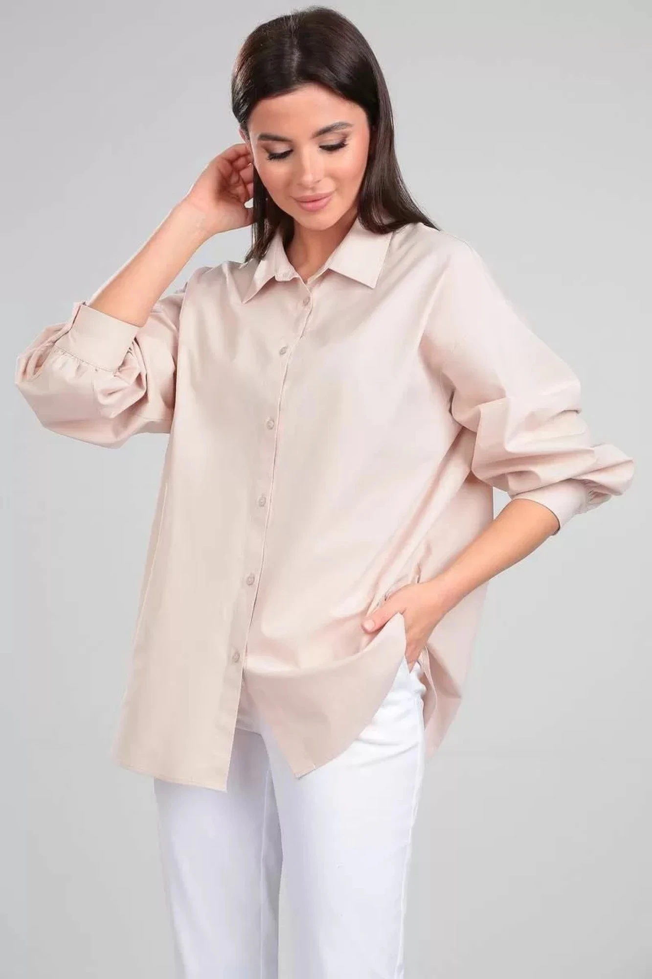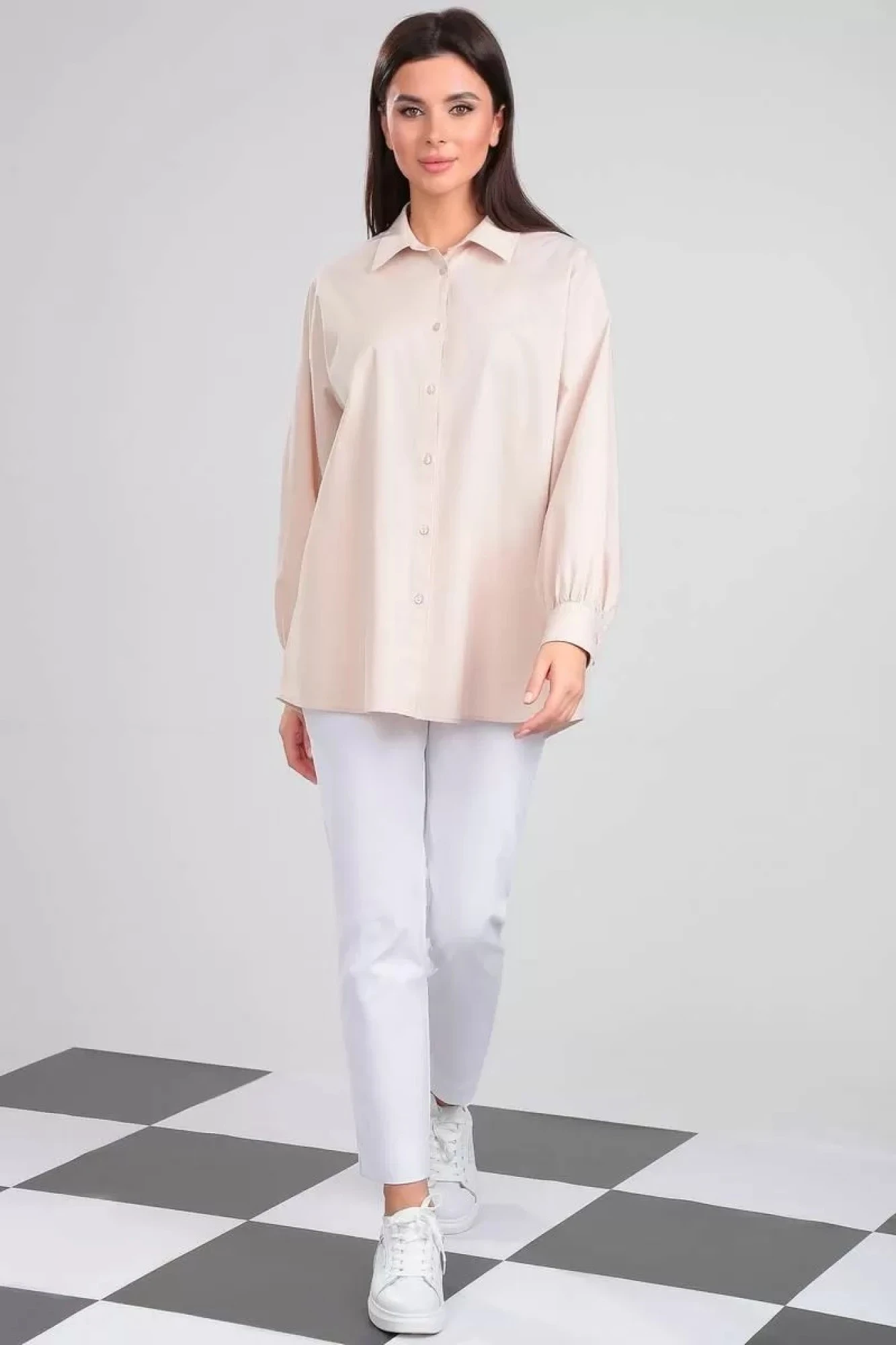 Блузка хлопковая свободного силуэта с приспущенной линией плеча. Рукав длинный, втачной, одношовный с притачной манжетой и сборкой по низу. Воротник стояче-отложной с отрезной стойкой. Застежка центральная бортовая на петли и пуговицы.