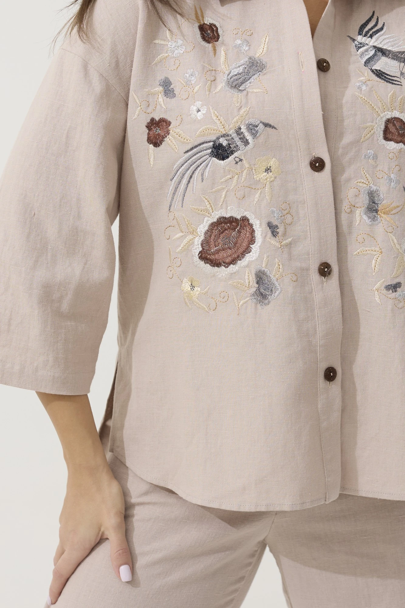 Воротник отложной рубашечного типа. Застежка центральная на петли и пуговицы, спинка с кокеткой. На полочке расположены две симметричные дизайнерские вышивки. Рукав 3/4 со спущеной линией плеча, одношовный.