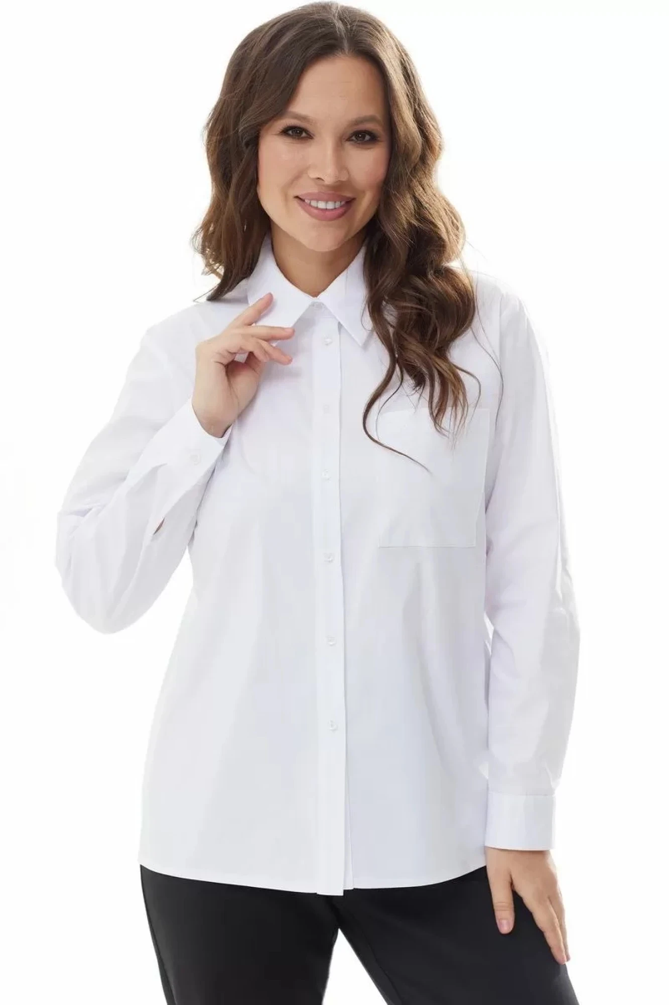 Стильная блуза прямого рубашечного кроя с центральной застежкой на пришивные пуговицы. Воротник отложной на стойке. Рукав длинный, втачной, дополнен притачной манжетой с застежкой на пришивную пуговицу. Слева блуза дополнена нагрудным накладным карманом.