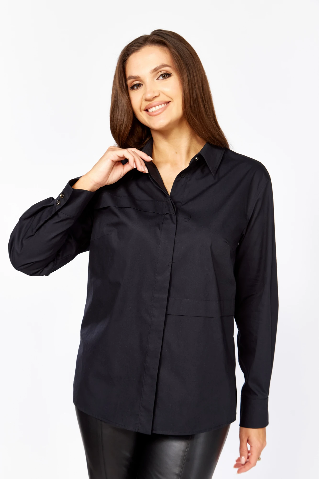 Хлопковая блузка-рубашка прямого силуэта. Рукав длинный рубашечный на манжете, воротник отложной рубашечный. По полочкам и спинке горизонтальные застроченные декоративные складки В боковых швах по низу разрезы