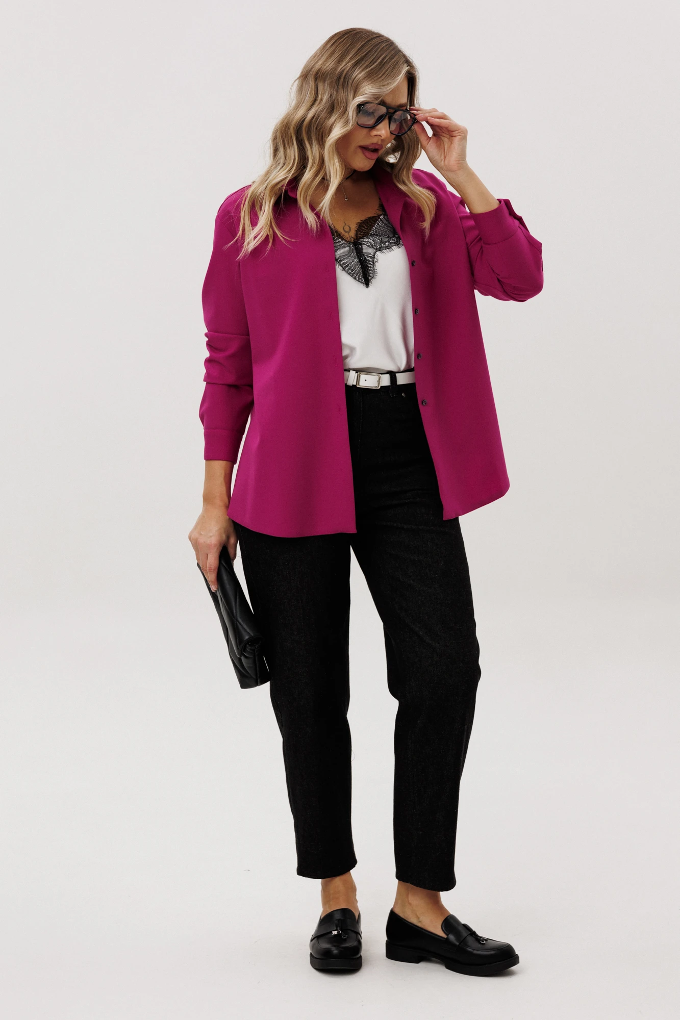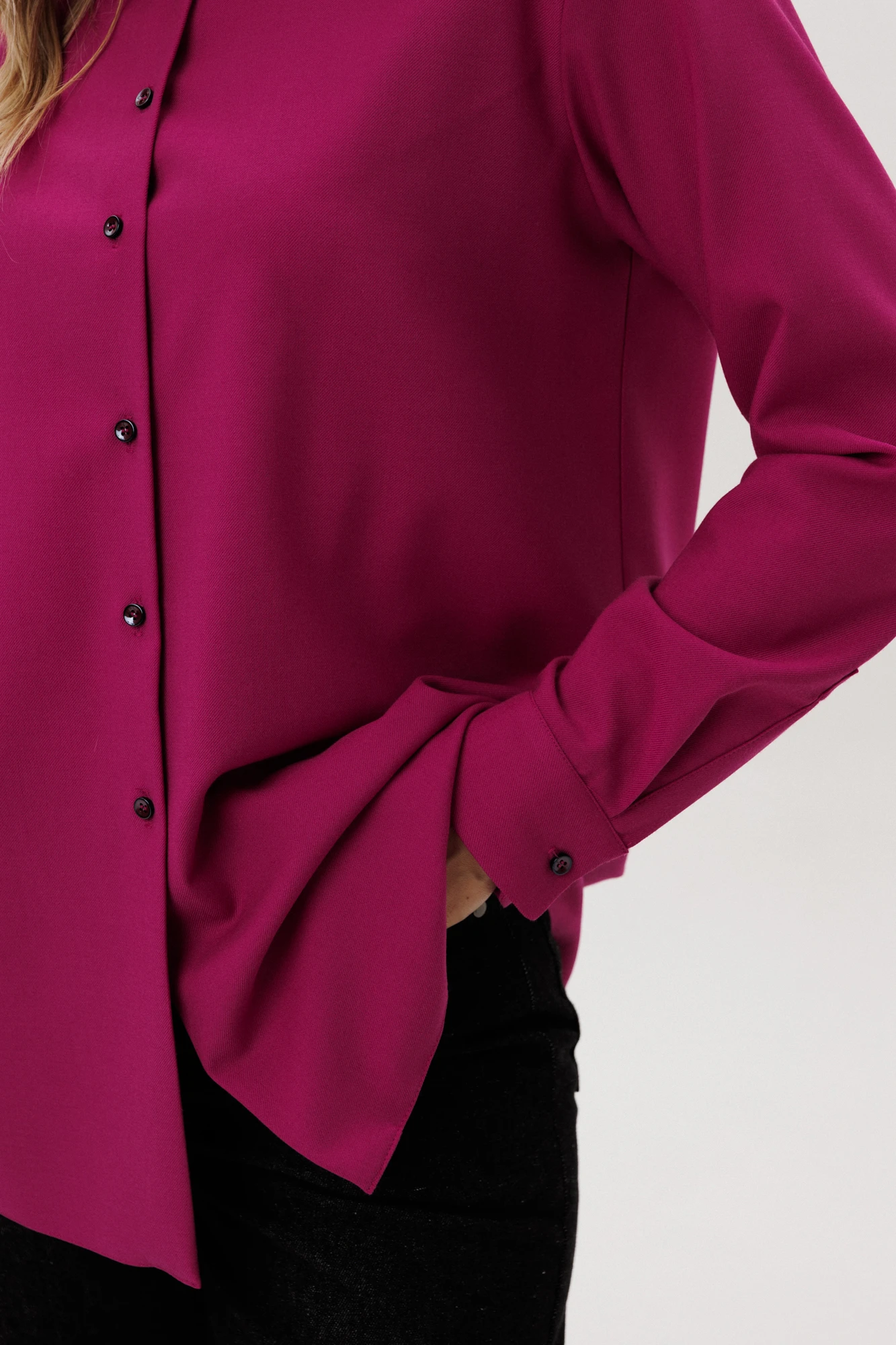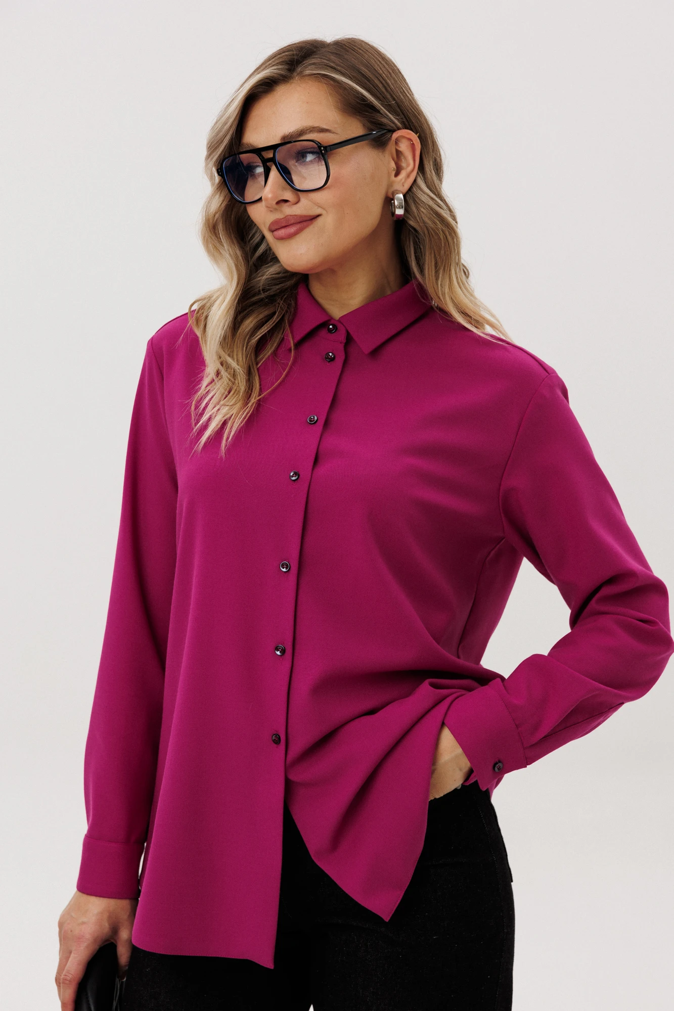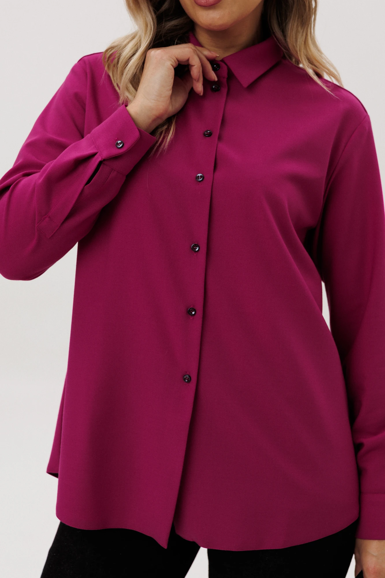 Рубашка прямого силуэта из полушерстяной , тонкой ткани. Воротник втачной со стойко, рукав втачной с манжетой. Застежка на петли-пуговицы.