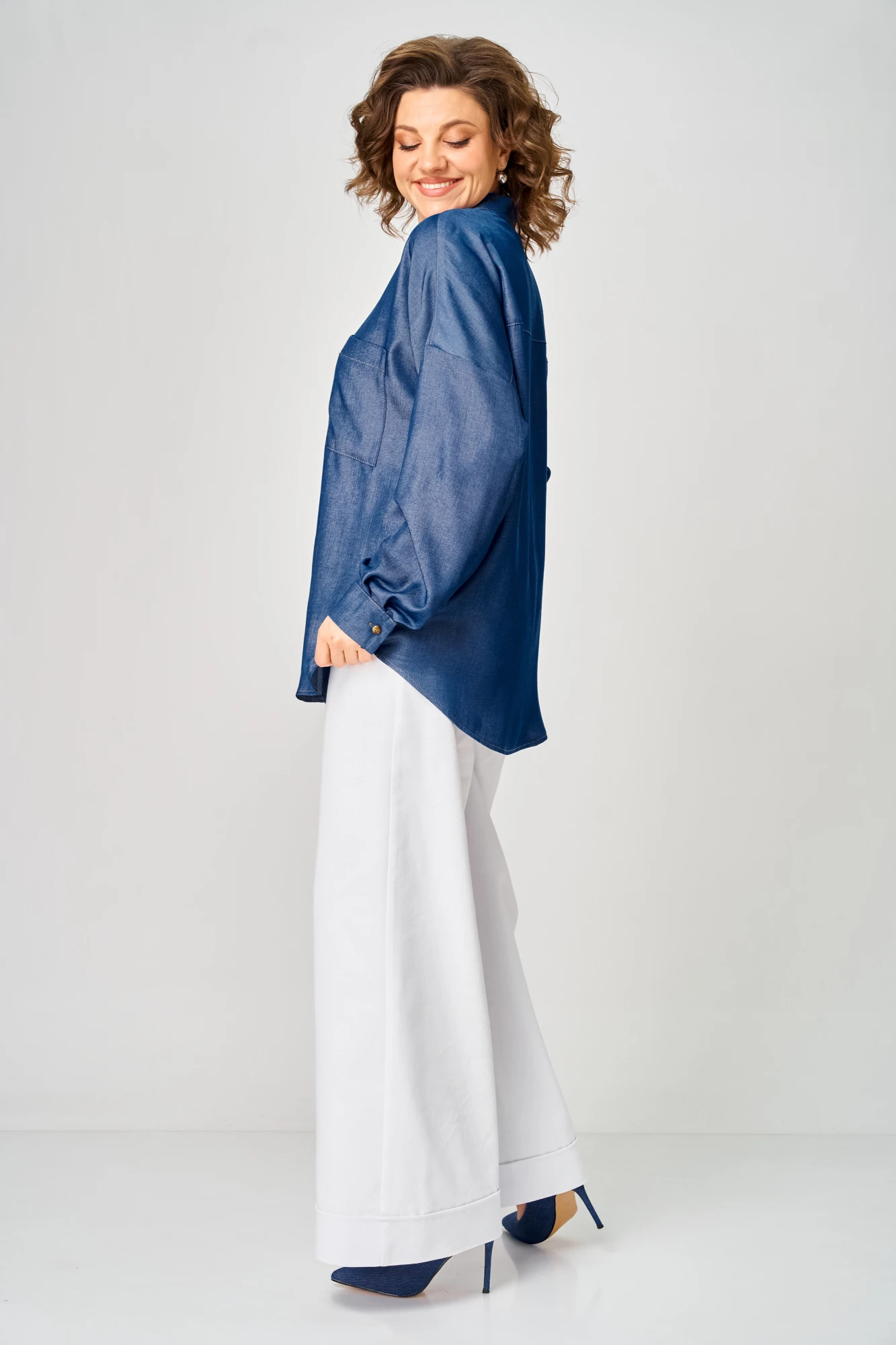 Рубашка женская джинсовая из вискозы (лёгкий деним) с характерным джинсовым плетением и мягким благородным блеском. Ткань струится, дышит и комфортна к телу, выглядит аккуратно весь день и не создаёт лишнего объёма. Свободный крой/оверсайз мягко скрывает нюансы фигуры — отличный вариант для работы, города и поездок.
