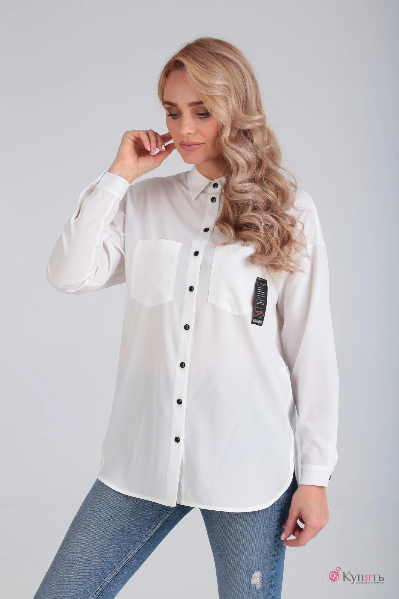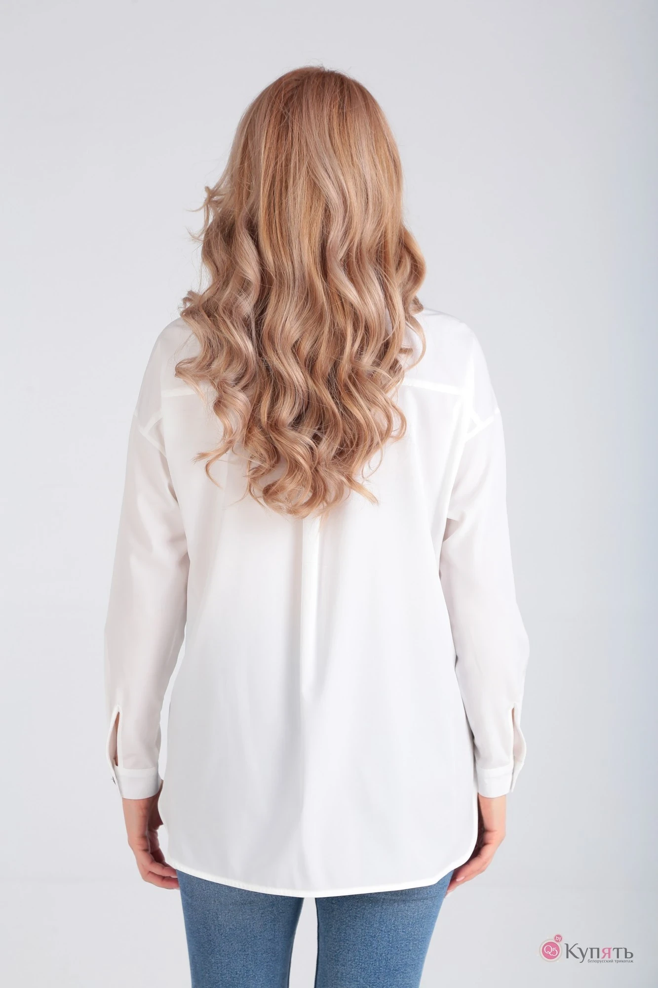 Стильная рубашка свободного кроя с цельнокроеной кокеткой полочки и спинки, со спущенной линией плеча. Модель прямого силуэта, c рубашечным воротником и рукавом на манжете. По переду рубашку украшают накладные карманы с декоративными элементами. Линия низа фигурная. Низ изделия обработан окантовкой. По спинке заложена и застрочена бантовая складка. По переду блузы планка на пуговицах.