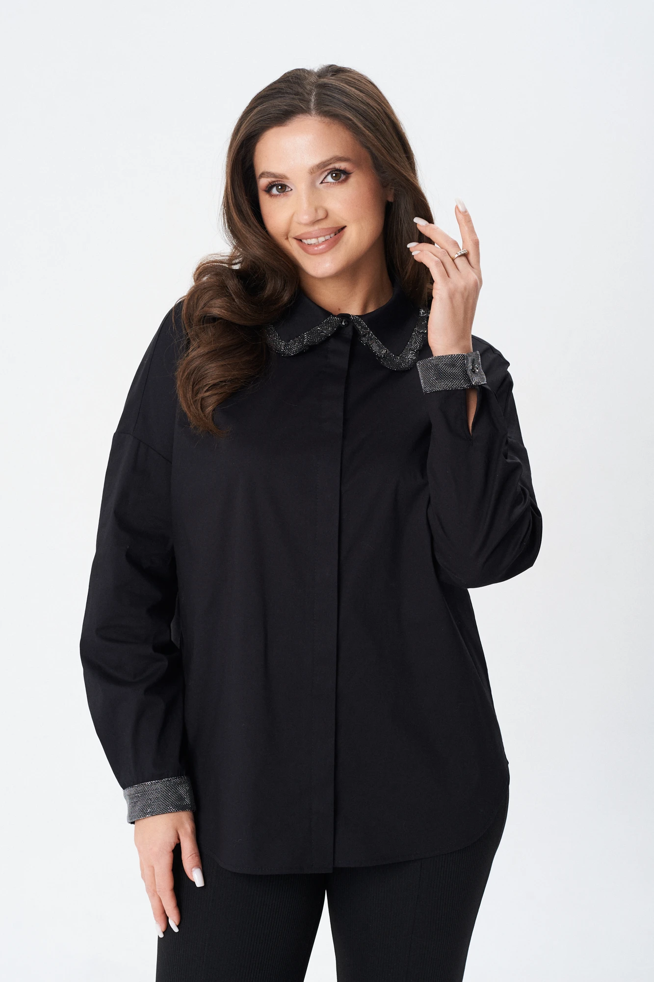 Стильная нарядная женская рубашка свободного кроя с рубашечным воротником и спущенной линией плеча. Воротник декорирован рюшей из отделочной ткани. По переду планка на застежку петли пуговицы. Рукав в тачной с манжетой из отделочной ткани. Спинка изделия цельная. Низ рубашки фигурный.