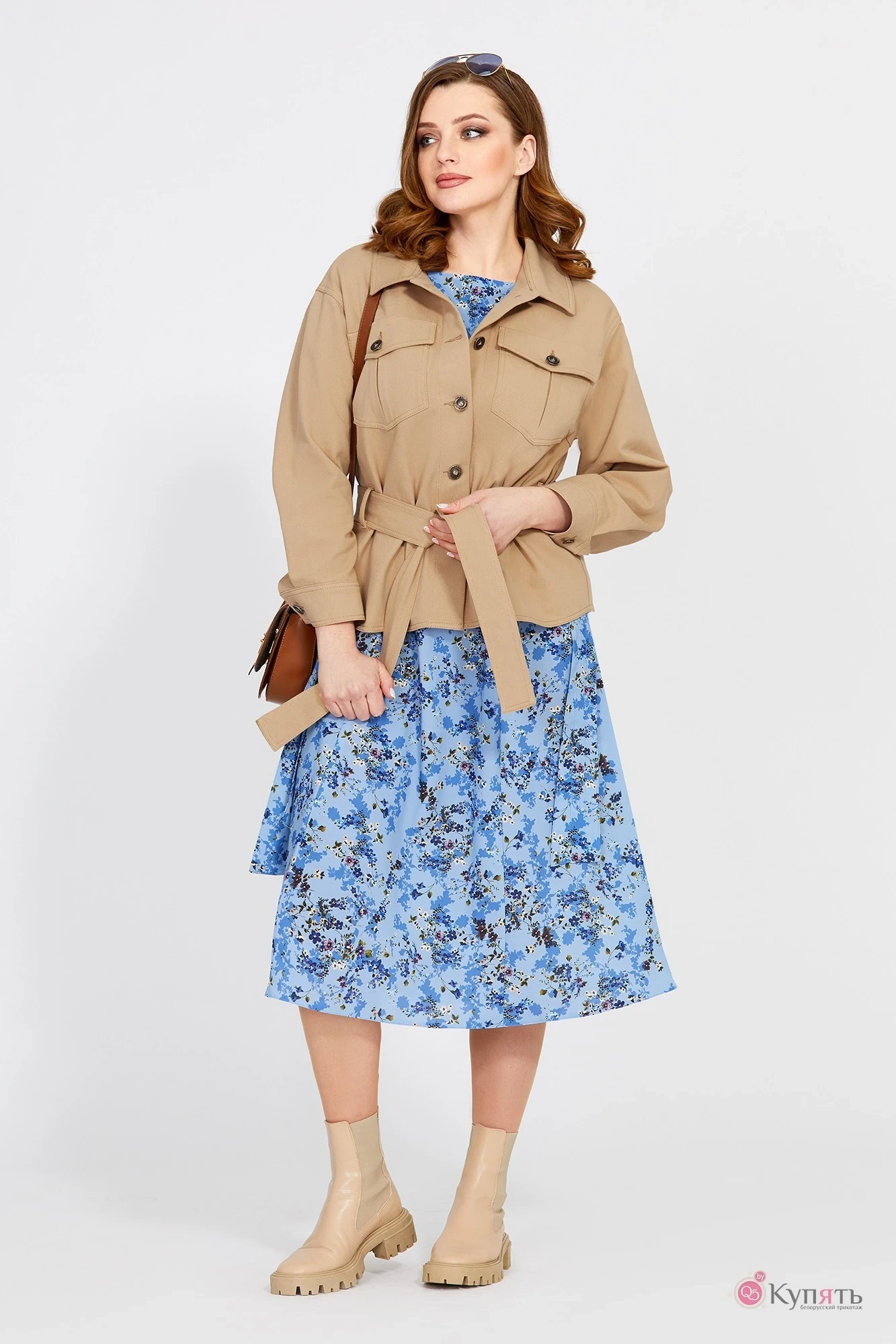 Блузон женский прямого силуэта для повседневной носки со спущенным плечом. Выполнен из джинсовой ткани (не тянется). Застежка центральная на обметанные петли и пуговицы, воротник рубашечного типа (без стойки). Рукав двух шовный, по низу на манжете, вставлен в открытую пройму. Декором служат накладные карманы по полочкам и съемный пояс из ткани, протянутый через шлевки. По всем деталям блузона двойные отделочные строчки.