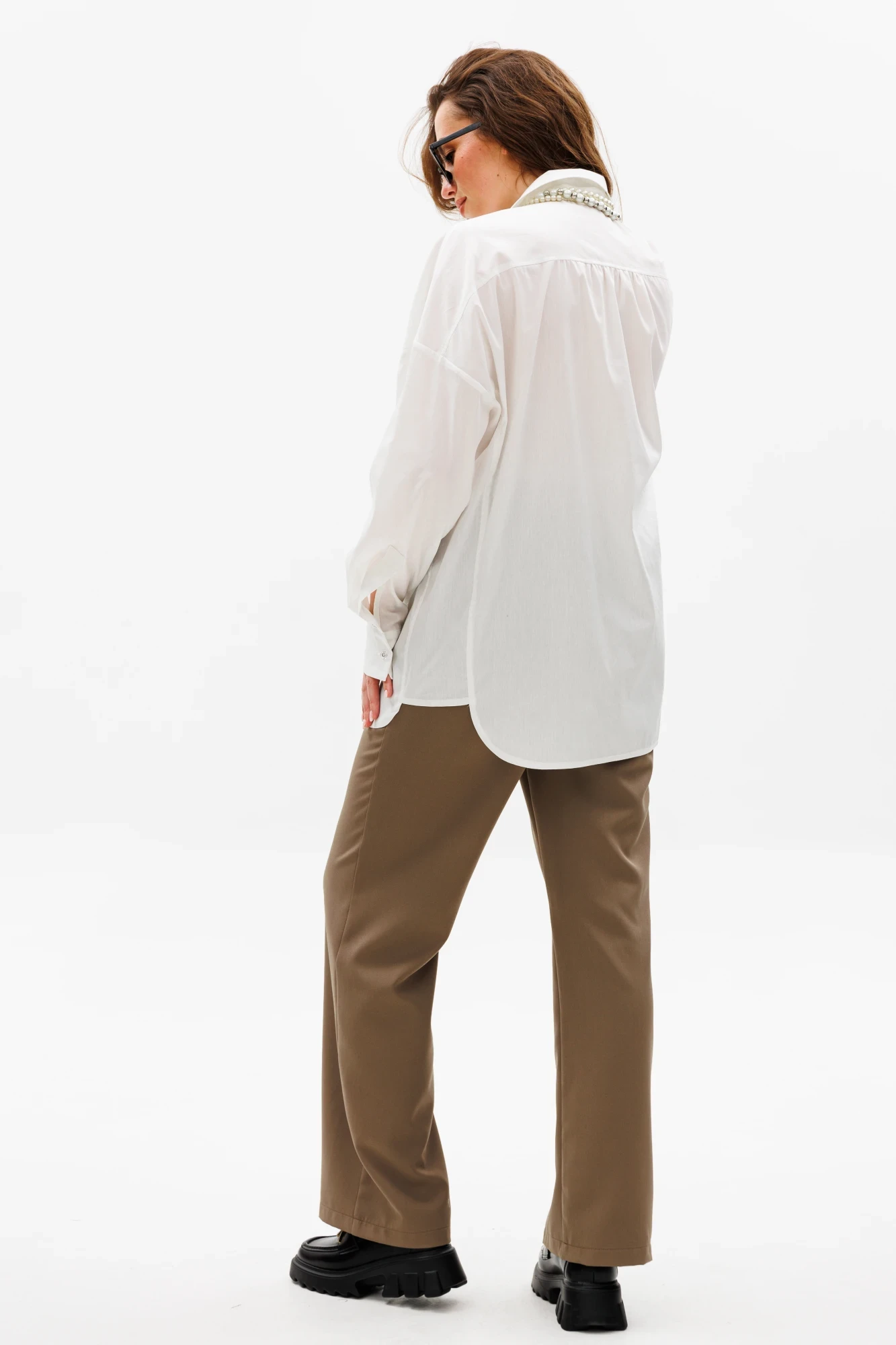 Рубашка прямого кроя объёма оверсайз со спущенной линией плеча с асимметричным бочком. Горловина обработана рубашечным воротником с отрезной стойкой. Застёжка центральная на петли и пуговицы. Есть нагрудный карман. Низ рукава обработан притачной манжетой, застёгивается на пуговицы.
