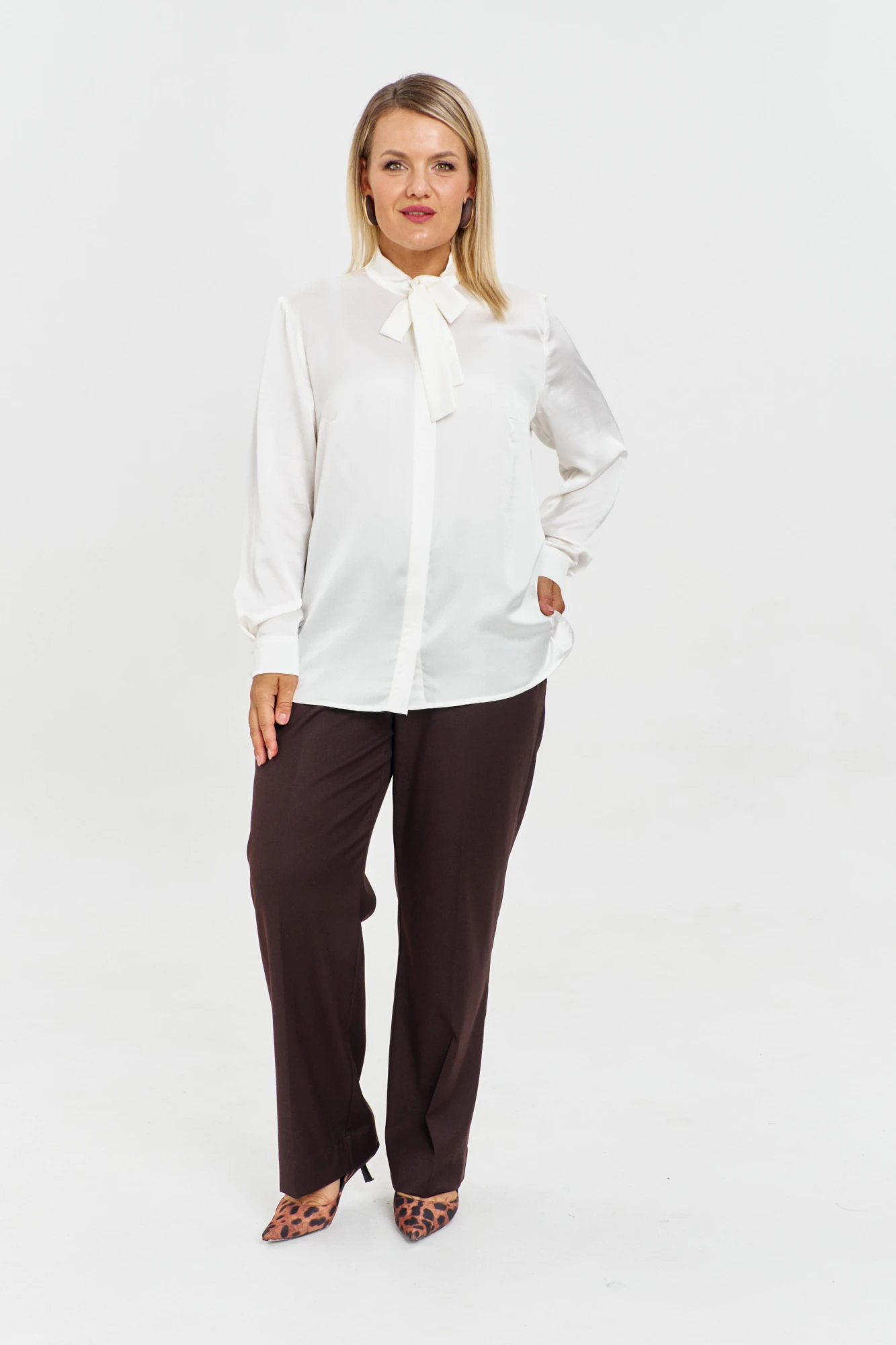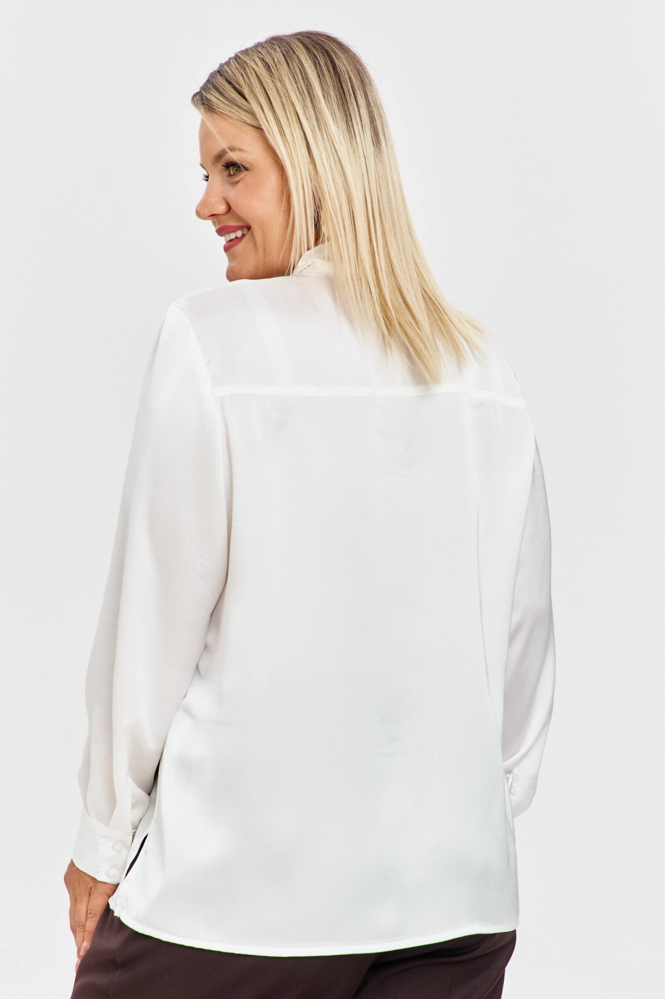 Блузка женская классическая -это универсальный предмет гардероба девушки. Блузка свободного силуэта. Воротник со стойкой и завязками на горловине. Рукав втачной, одношовный, внизу на манжете, с застежкой на петлю-пуговицу. Внизу по боковым швам обработаны разрезы. Полочка со скрытой застежкой на петли-пуговицы. По спинке – кокетка. Ткань эластичная, струящаяся. Благодаря удачным лекалам, рубашка займет любимое место в вашем гардеробе.
