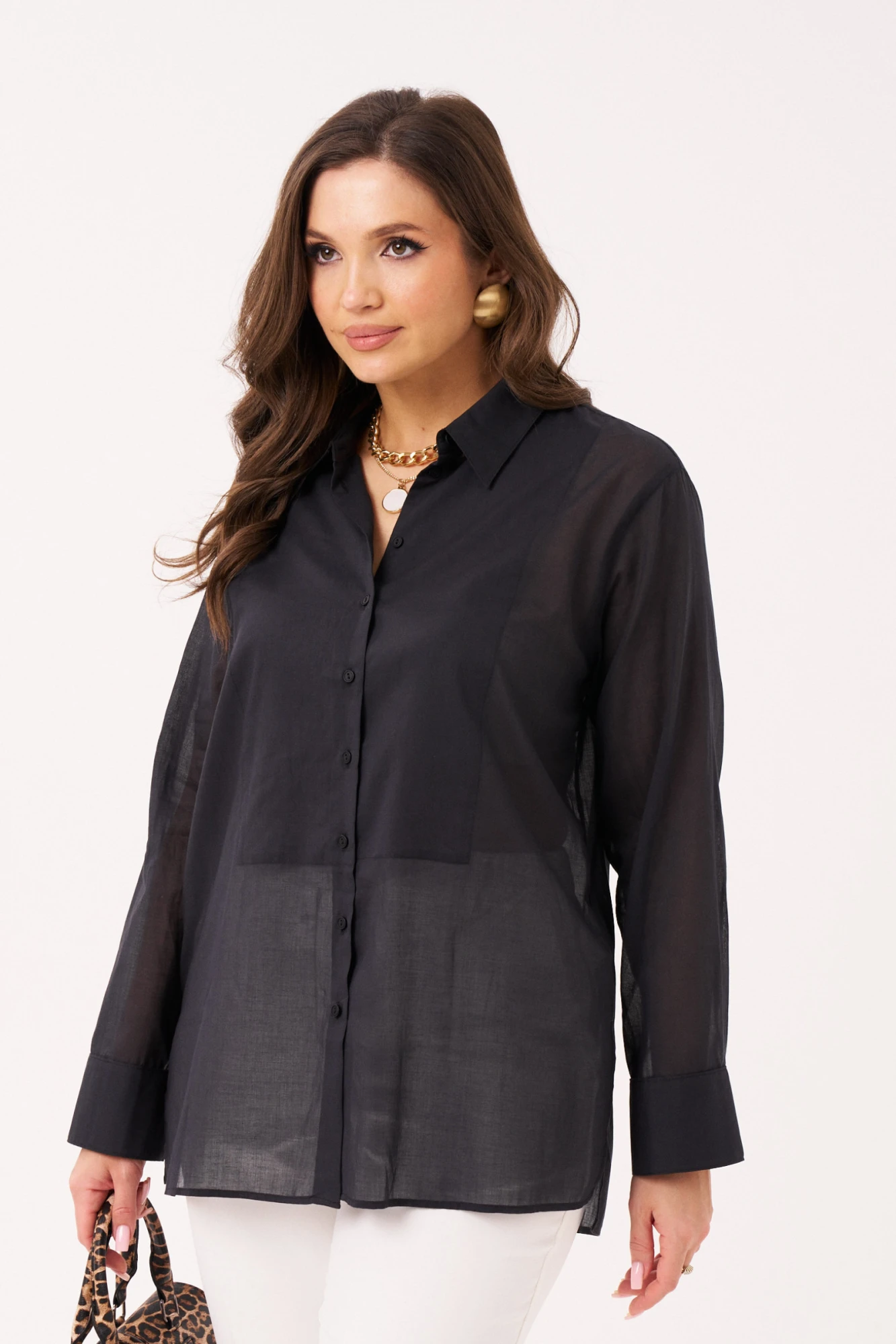 Блуза из хлопковой ткани для повседневной носки. Изделие прямого кроя с фронтальной застежкой по переду, настрочной деталью по груди. Рукав длинный втачной, оформлен притачной манжетой, застегивающейся на пуговицы. Блуза классической длины с разрезами в боковых швах от низа.
