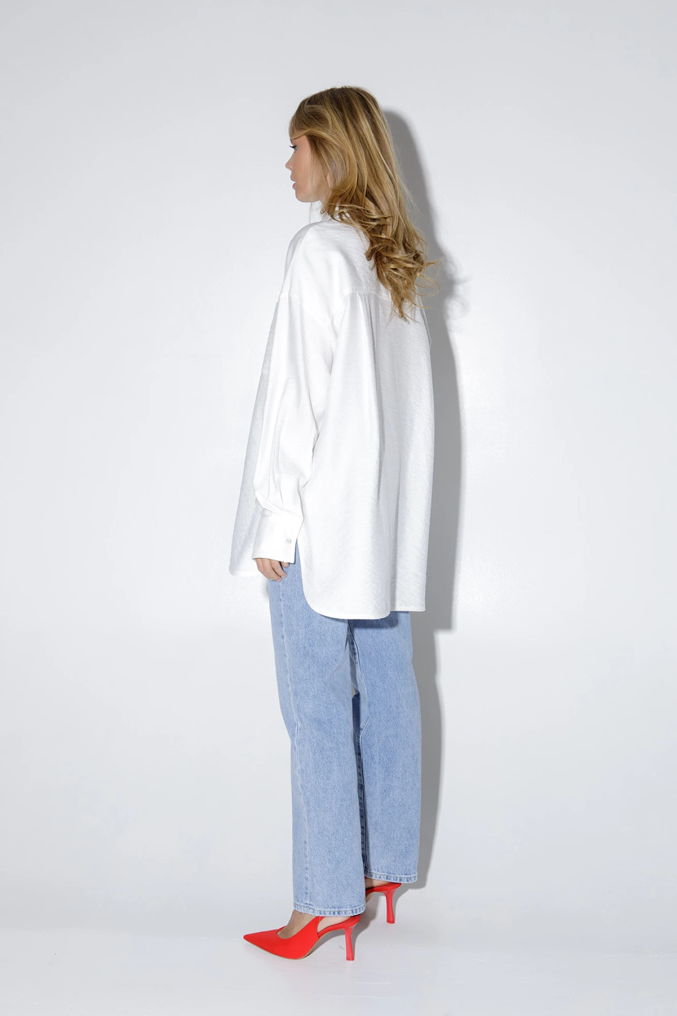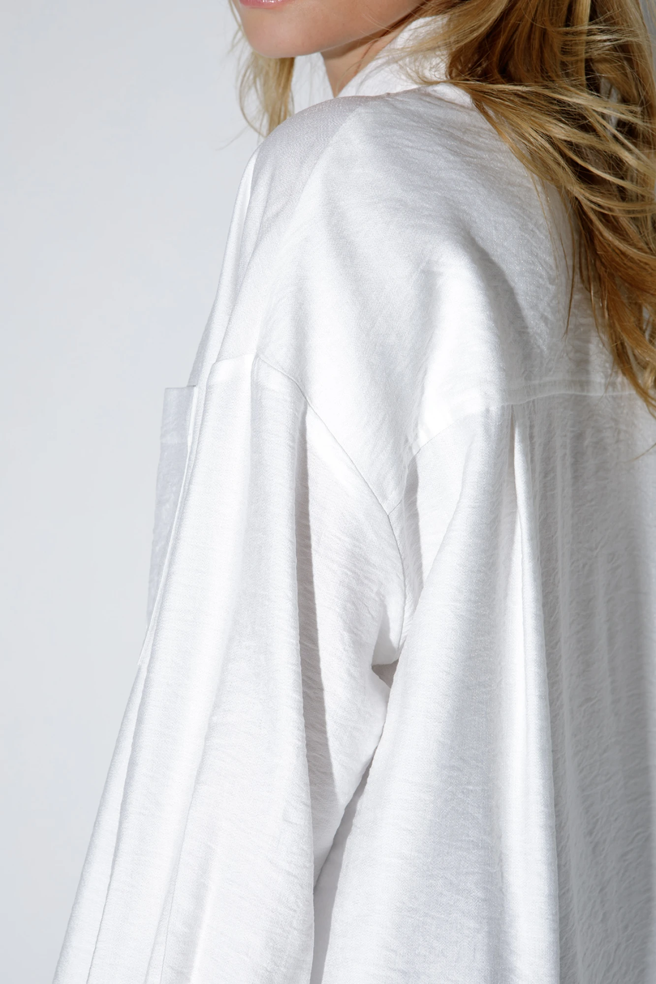 Оверсайз рубашка из вискозы. Детали: рубашка прямого силуэта, спущенная линия плеча, застежка на петли и пуговицы, длинные рукава с притачными манжетами, фигурный низ. Длина рубашки по спинке около 78 см, длина рукава+ плечо около 56+8= 64 см.