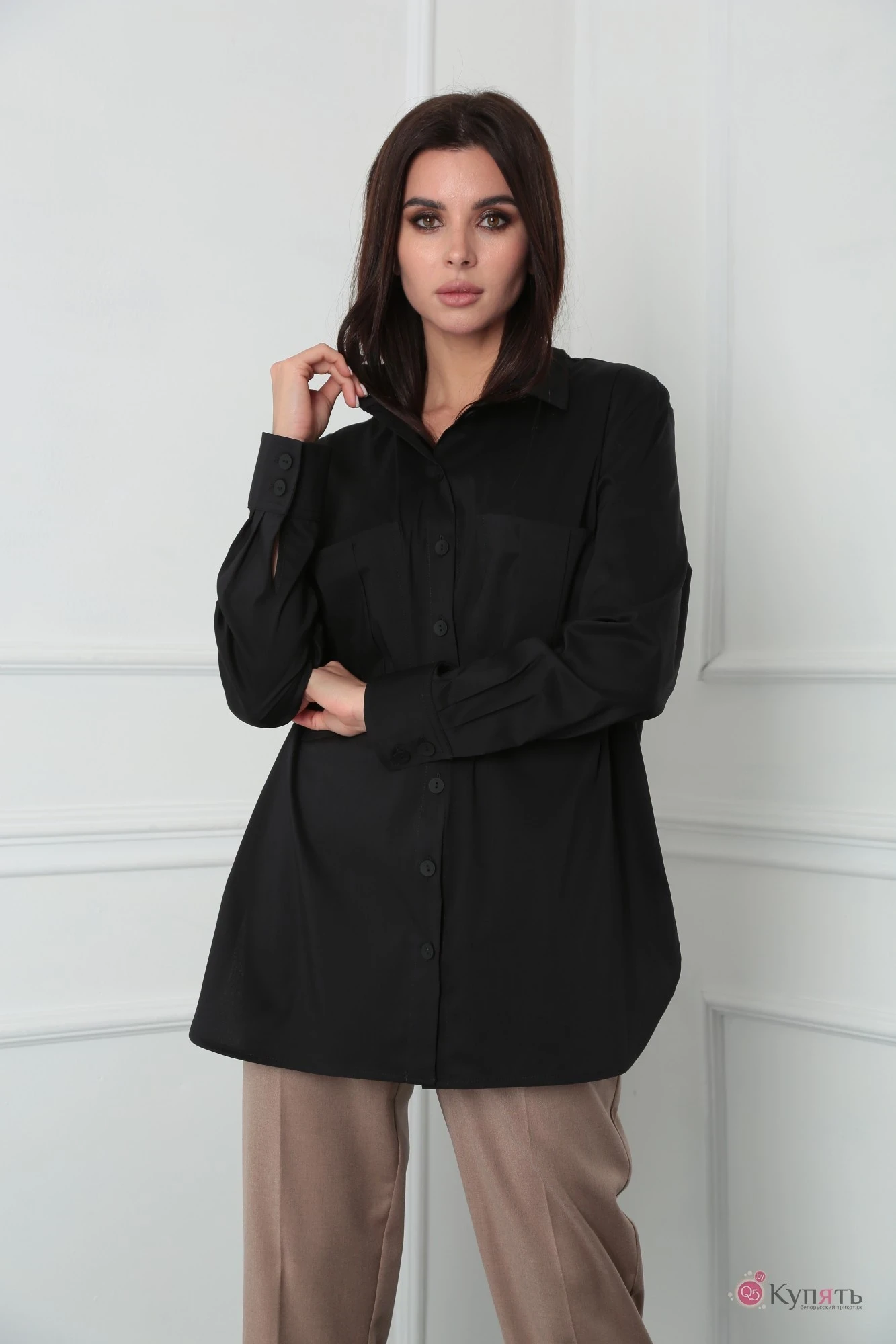 Блузка прямого силуэта из хлопковой ткани, длиной ниже линии бёдер, с рукавами, длиной до запястья, с рубашечным воротником, со слегка спущенной линией плеча, с застёжкой на петли-пуговицы на цельнокроёной планке. Передние половинки с нагрудными вытачками из боковых швов, с фигурными накладными карманами. Карманы с бантовой складкой по центру, настрочены на детали переда отделочной строчкой 0,7 см. Спинка с отрезной кокеткой и бантовой складкой по центру нижней части спинки. Рукава втачные рубашечные, по шву притачивания манжет заложены по две складки, разрез застёжки рукава окантован. Застёжка манжет на две петли и пуговицы. По манжетам прострочена отделочная строчка – 0,7см.Воротник с прямыми концами, на притачной стойке, стойка со скруглёнными концами и застёжкой на петлю и пуговицу.Низ переда и спинки фигурный, скруглён к боковым швам, с высокими разрезами. Срез низа окантован и застрочен отделочной строчкой.