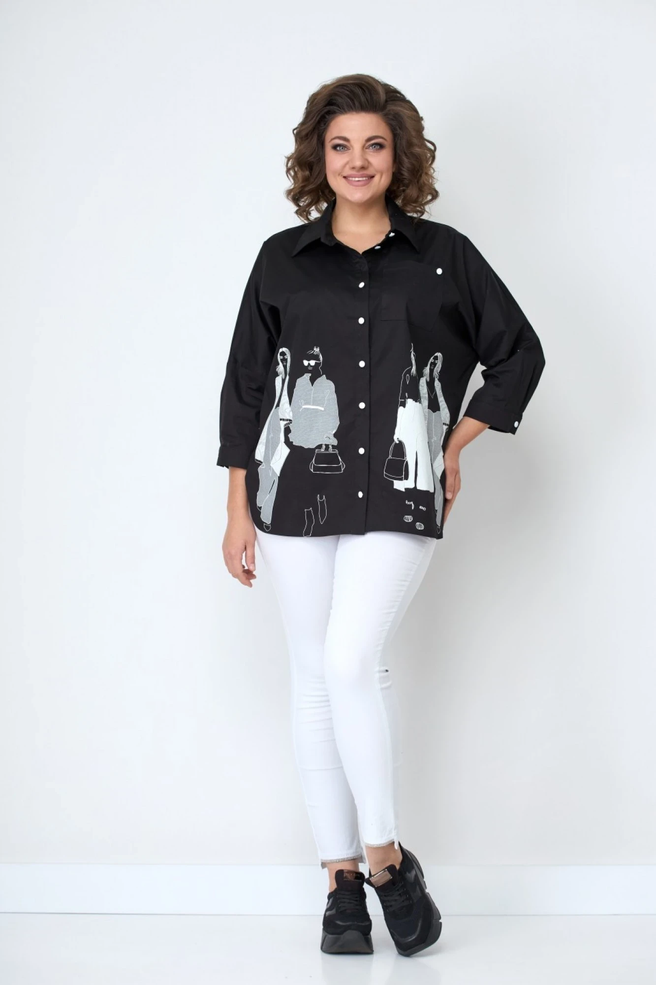 Блузка женская из хлопковой ткани. Подойдет для женщин разной возрастной категории и разного телосложения. Блузка удлиненная, свободного кроя. Застежка-планка с прорезными петлями на пуговицах. Спинка свободного кроя без талиевых вытачек. По центру спинки кокетка. Воротник рубашечного типа. Низ изделия с фигурными вырезами по боковому шву. Украшением изделия служит печать. Линия плеча спущенная, рукав притачной, по низу рукава манжет с застежкой на пуговицу. Есть накладной карман.