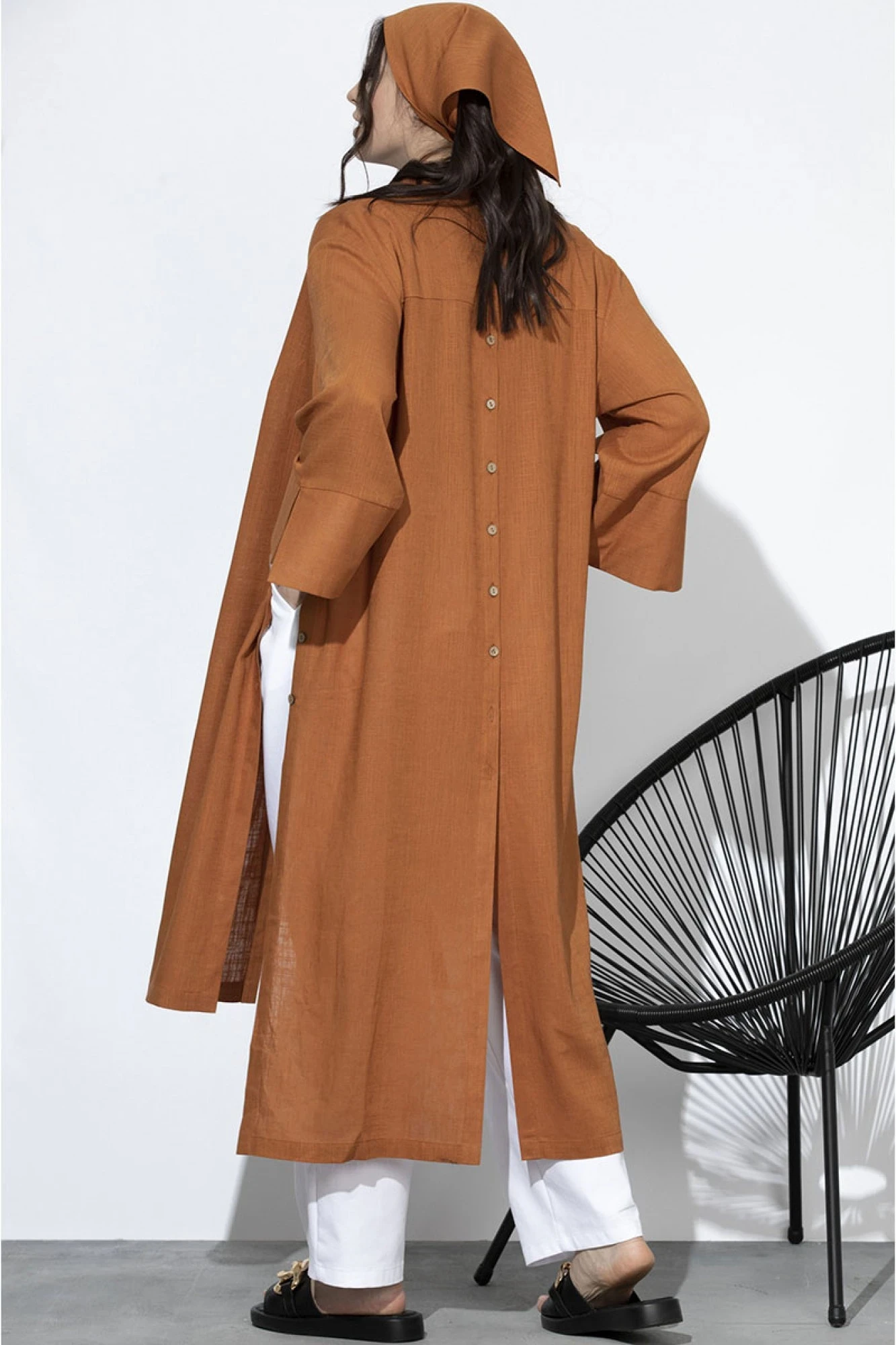 Этот вариант удлиненной рубашки идеален. Ее можно носить как рубашку-платье, как накидку, при это не застегивая на все пуговицы.