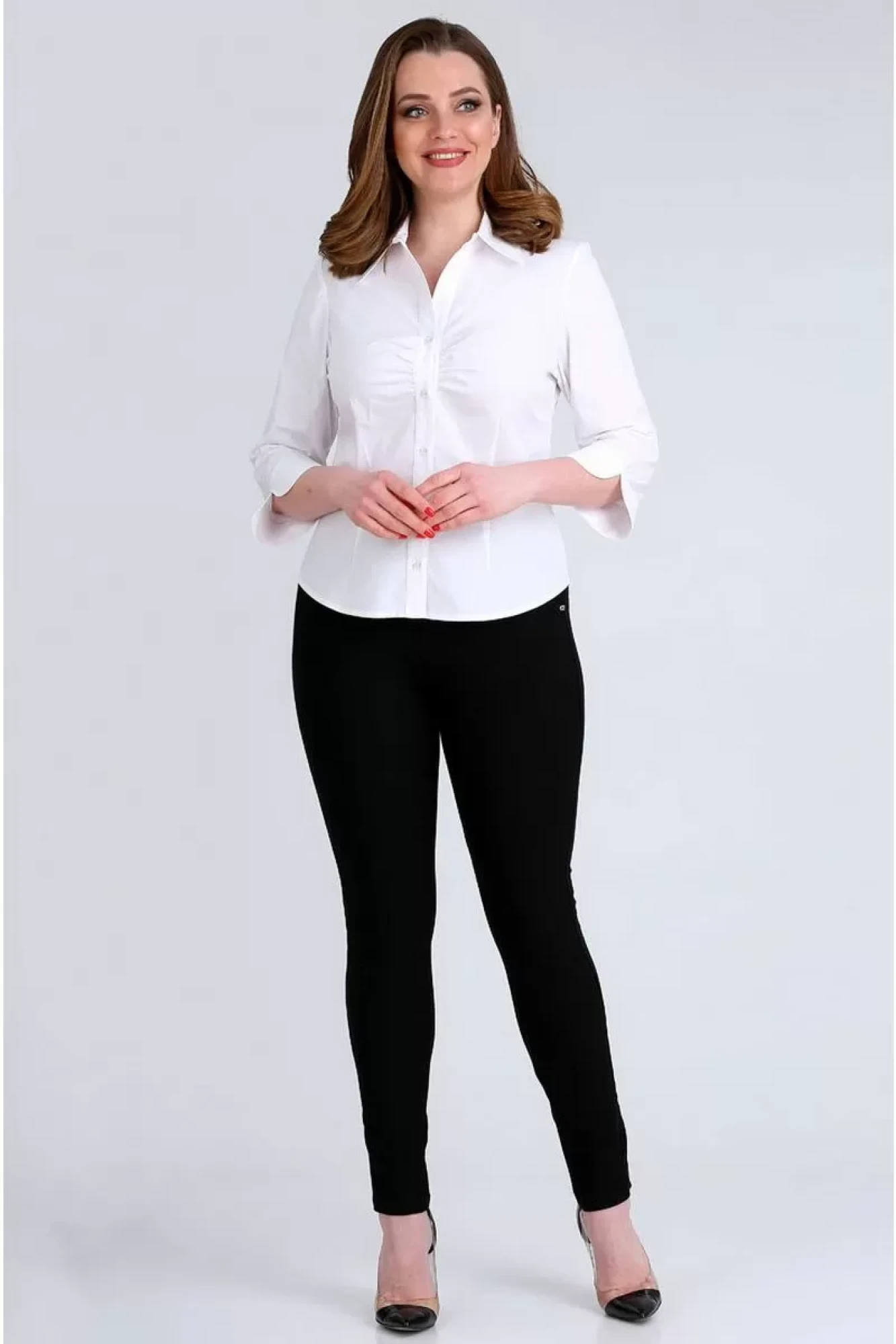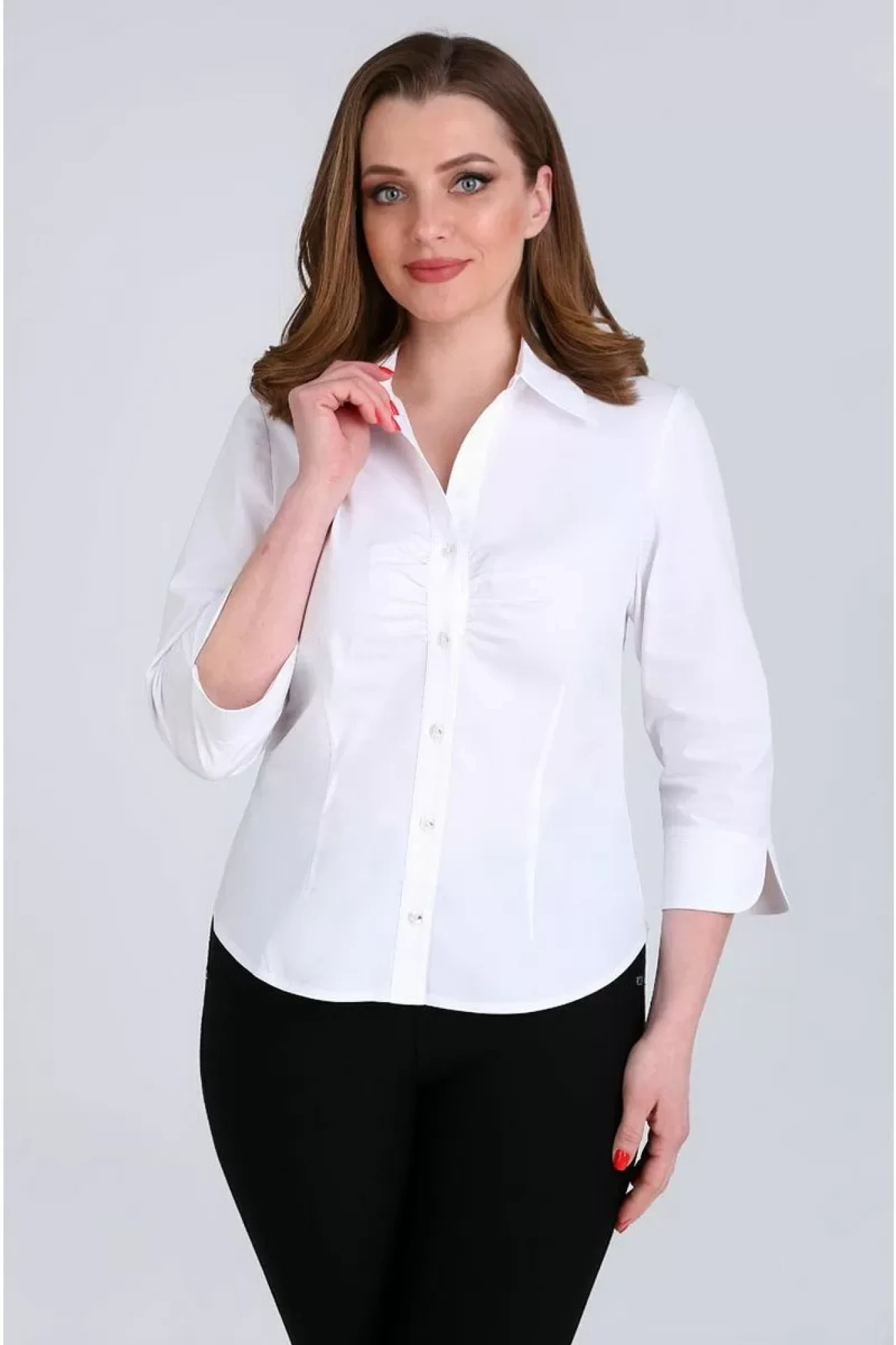 Блуза женская, приталенного силуэта. Застежка центральная на планку, в области линии груди у планки полочка присобирается. Воротник рубашечный на стойке. На спинке и полочках обработаны талевые вытачки. Рукав втачной, одношовный с притачным манжетом, закругленные края которого прикрепляются в стык по центру среза рукава.