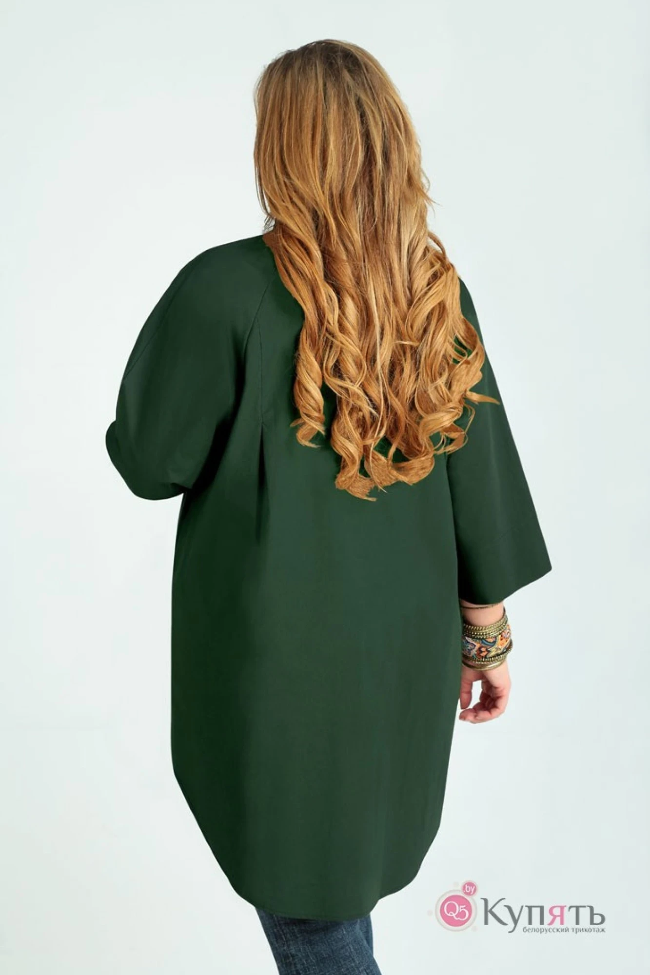 Туника женская из хлопкового полотна, свободного кроя с центральной застежкой на планку. Воротник рубашечный на стойке. Рукав-реглан с центральным швом, длиной ¾ -(59) см, низ обработан манжетом, которым можно регулировать длину, подвернув манжет. На спинке, от швов рукава-реглан застрочены неглубокие складки, дающие дополнительную свободу движения. В боковых швах обработаны боковые карманы.