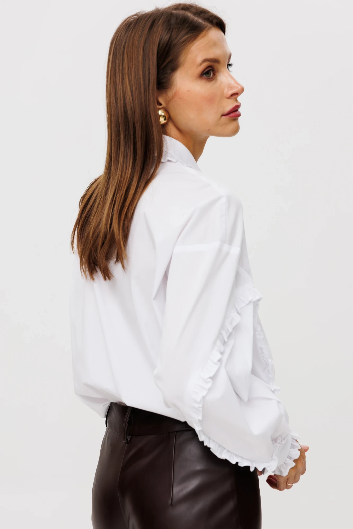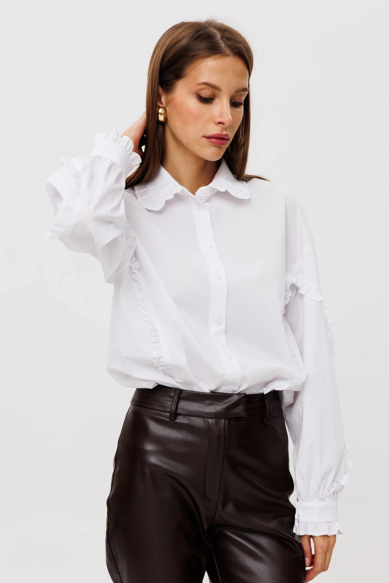 Рубашка выполнена из хлопковой ткани, свободного кроя. Рукава втачные, спущенные с отделочными элементами -рюши. Низ рукава на притачной манжете , воротник -стойка , рубашечного типа, застежки на петли-пуговицы.