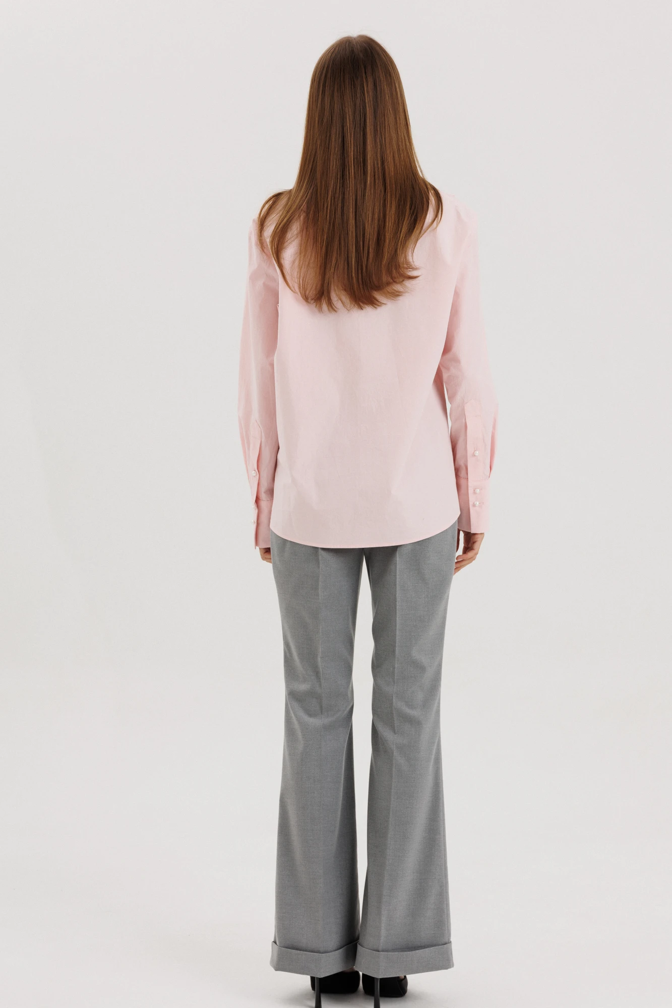 Классическая рубашка пудрового розового цвета , V-образным вырезом и длинными рукавами, линия плеча немного спущена, рукав притачной,по переду нагрудный накладной карман квадратной формы Застёжка центральная на петли - пуговицы. Низ блузки фигурной формы. Блузка выполнена из рубашечной ткани - жатка с легким эффектом мятости. Акцентная деталь -- жемчужные пуговицы. на манжете застежка на три петли-пуговицы. Длина по спинке 71см, длина рукава от линии шва 60 см, высота манжеты 11 см. Рост модели на фото 178 см.