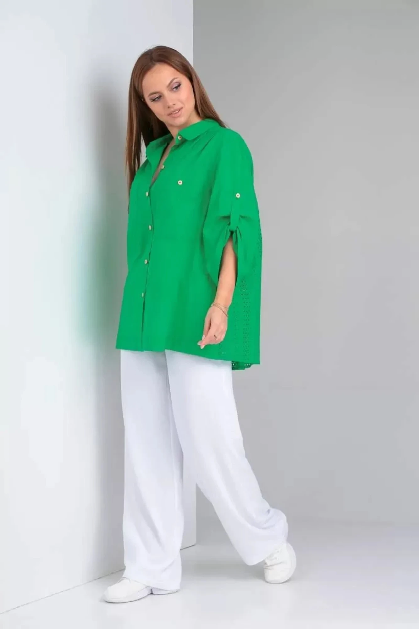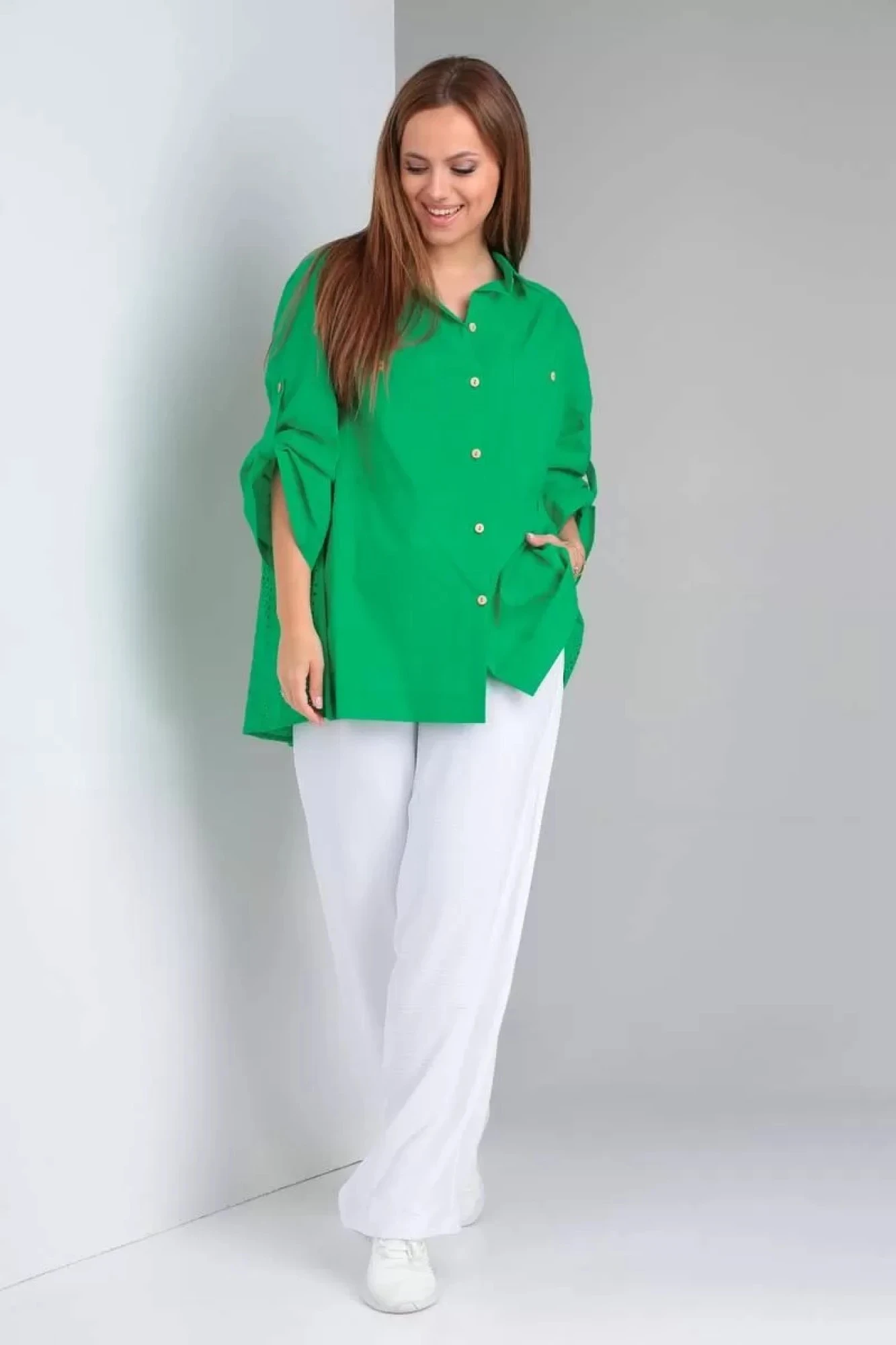 Рубашка из легкой хлопковой ткани с шитьем в стиле оверсайз. По переду застежка на петли-пуговицы, карманы, кокетка в области плеча с двумя складками. По спинке складка по центру от линии кокетки. Рукав втачной 3/4, длина регулируется отделочной патой. Воротник рубашечного типа на стойке.