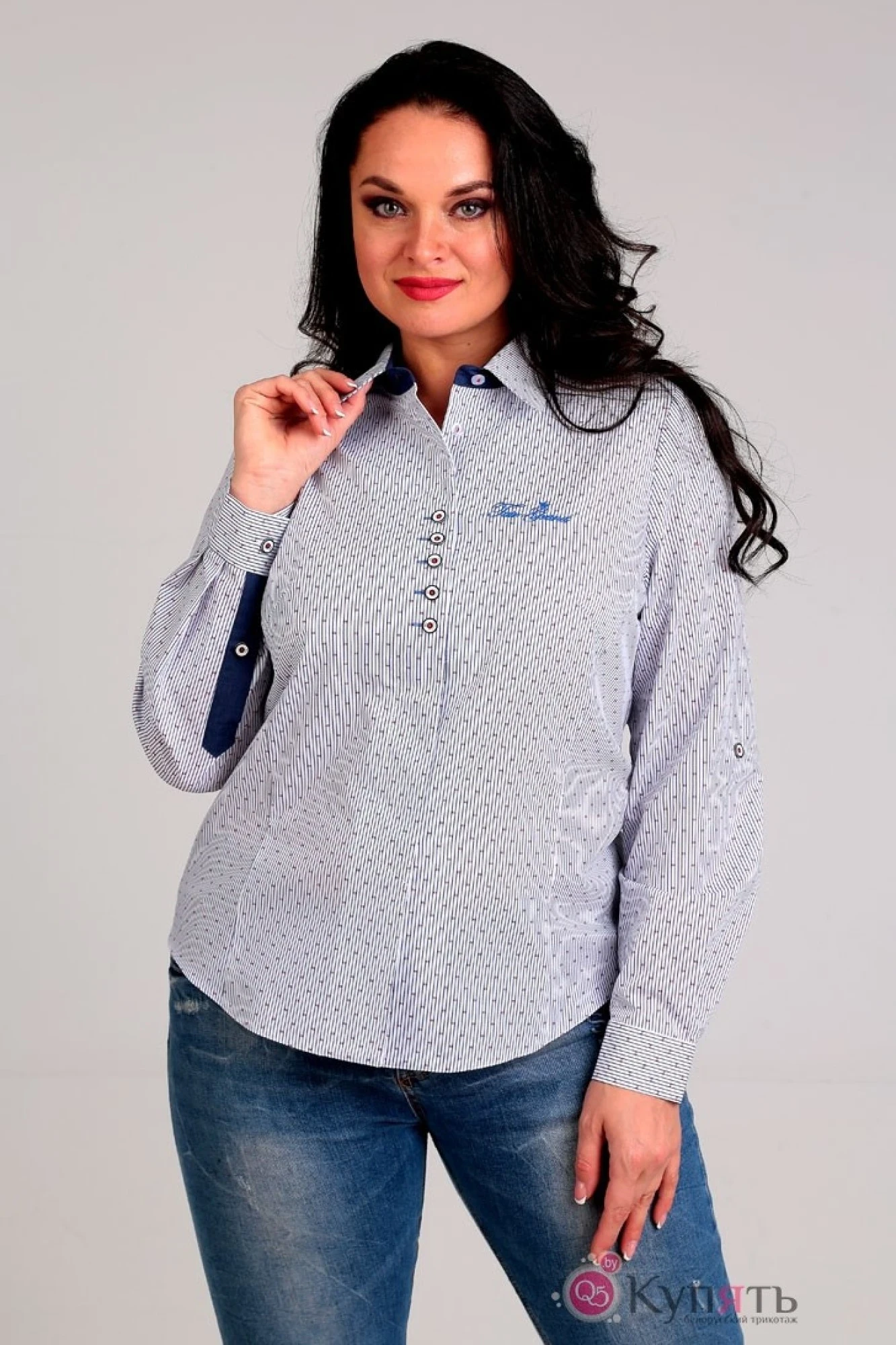 блуза приталенного силуэта, с центральной бортовой застежкой на потайной планке. С лицевой стороны правой полочки выполнены декоративные петли контрастного цвета. На полочках от продольных рельефов идут нагрудные вытачки. Рукав втачной с притачным манжетом , длину которого можно отрегулировать «патой», разрез выполнен планкой в виде «домика». На спинке имеются талевые вытачки. Воротник на стойке, рубашечный.