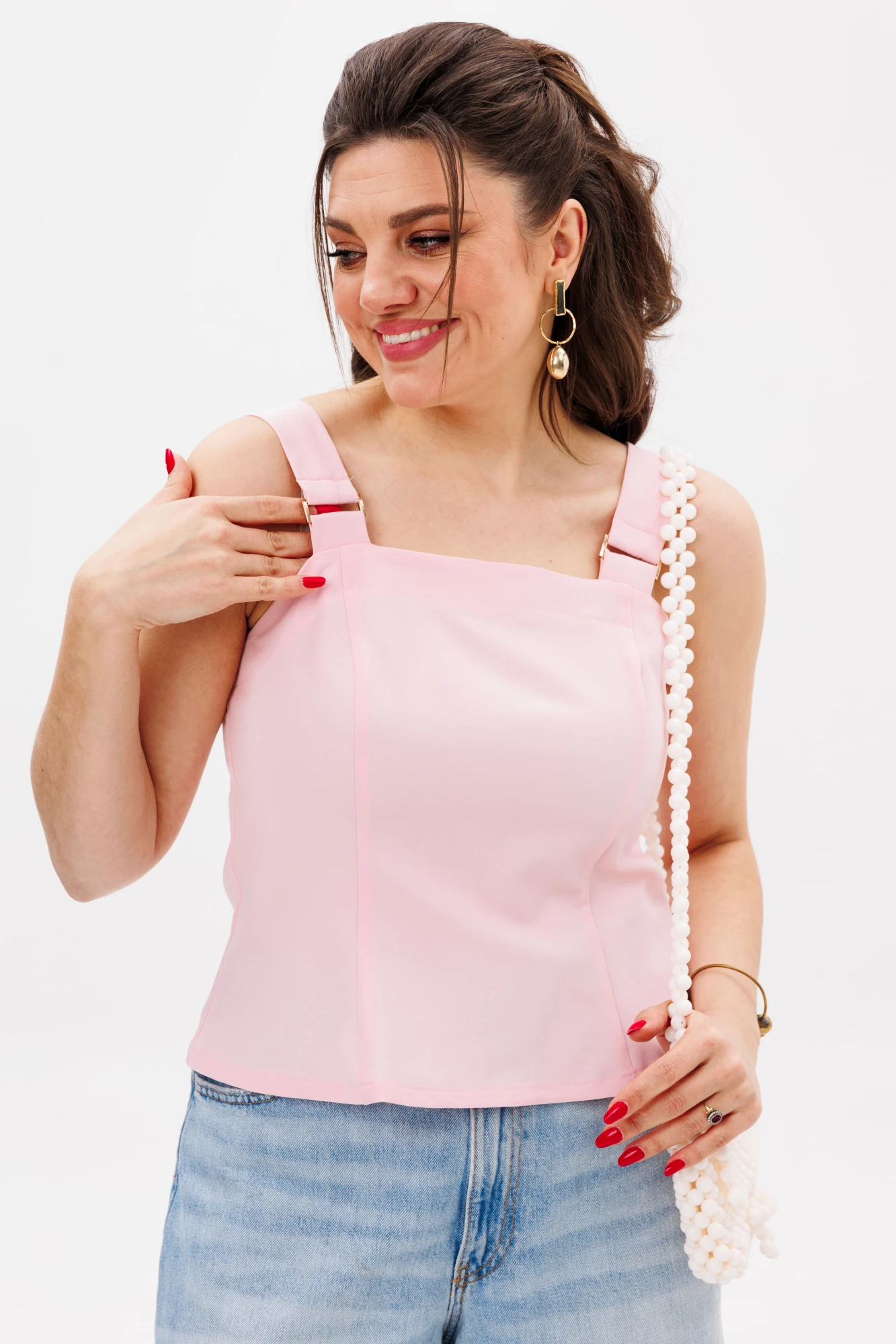 Полуприлегающий силуэт с рельефами по переду и спинке. Широкие бретели с декоративными деталями по переду дополняют образ. Застежка на молнию в среднем шве спинки.