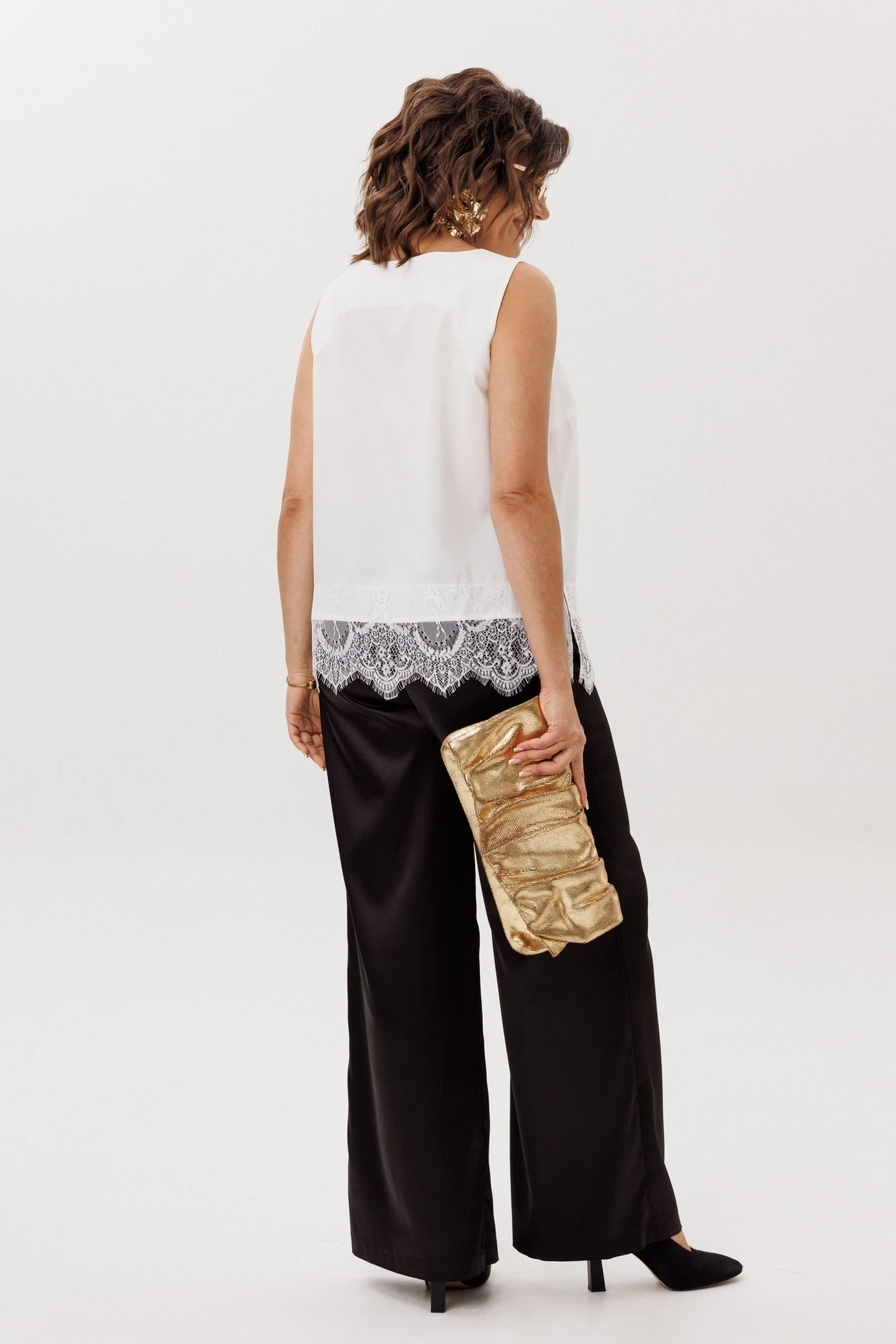 На модели в топе цвета «кристаллики льда» атласные брюки 1737, юбка 1510, блузон в пайетки 1522 и жакет 1661.