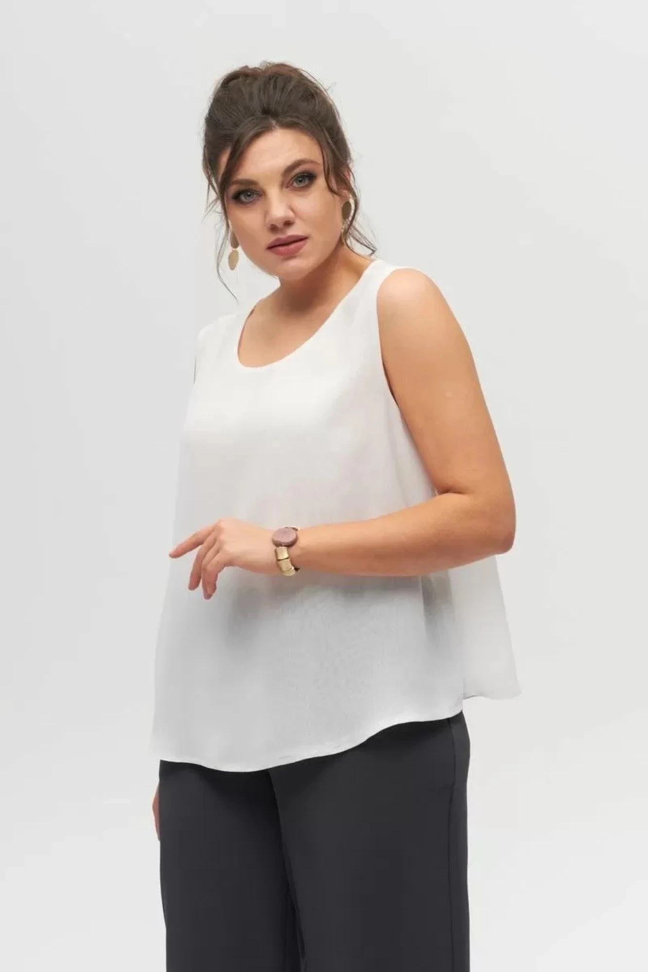 Топ свободного силуэта, немного расширенного к низу, перед двойной, не просвечивает, по спинке выполнен разрез-щель с застёжкой на навесную петлю и красивую пуговицу.