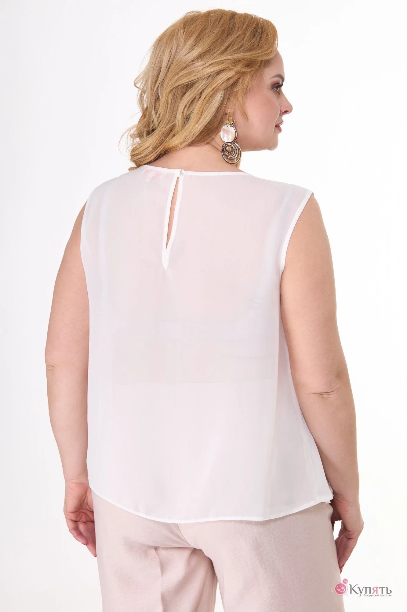 Топ свободного силуэта, немного расширенного к низу, перед двойной, не просвечивает, по спинке выполнен разрез-щель с застёжкой на навесную петлю и красивую пуговицу.