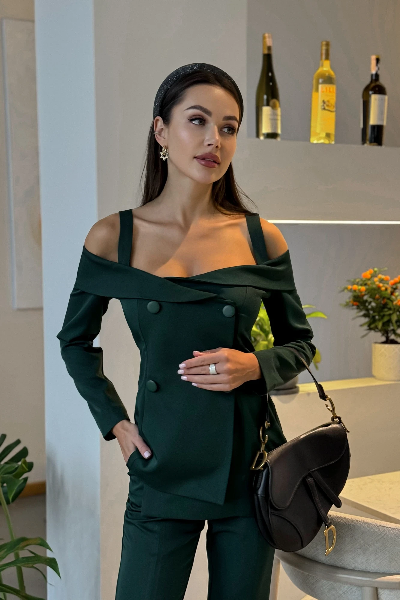 Топ элегантного фасона, бретели съёмные, застёгиваются изнутри на поайные пуговицы. Борта ассиметричные, застёгиватся на 2 ряда пуговиц в цвет изделия, рукав прямой, одношовный. Лиф обработан вырезом, открывающим предплечья.