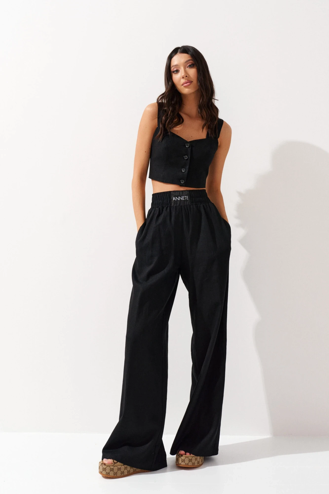 Топ прилегающего силуэта выполнен из льняного полотна черного цвета. Характеристики: прилегающий силуэт, фигурный вырез горловины, широкие бретели, застежка центральная на петли пуговицы. Длина от верхнего края бретели 36 см. Образ дополнят брюки артикул А 1218
