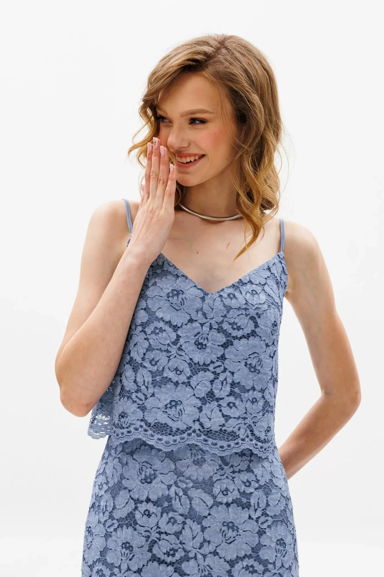 Топ выполнен из гипюра. Топ рямого силуэта, длиной до линии талии. Горловина переда V-образной формы. Перед на отлетной по низу подкладке. Топ на регулируемых бретелях. По низу топа фестоны.