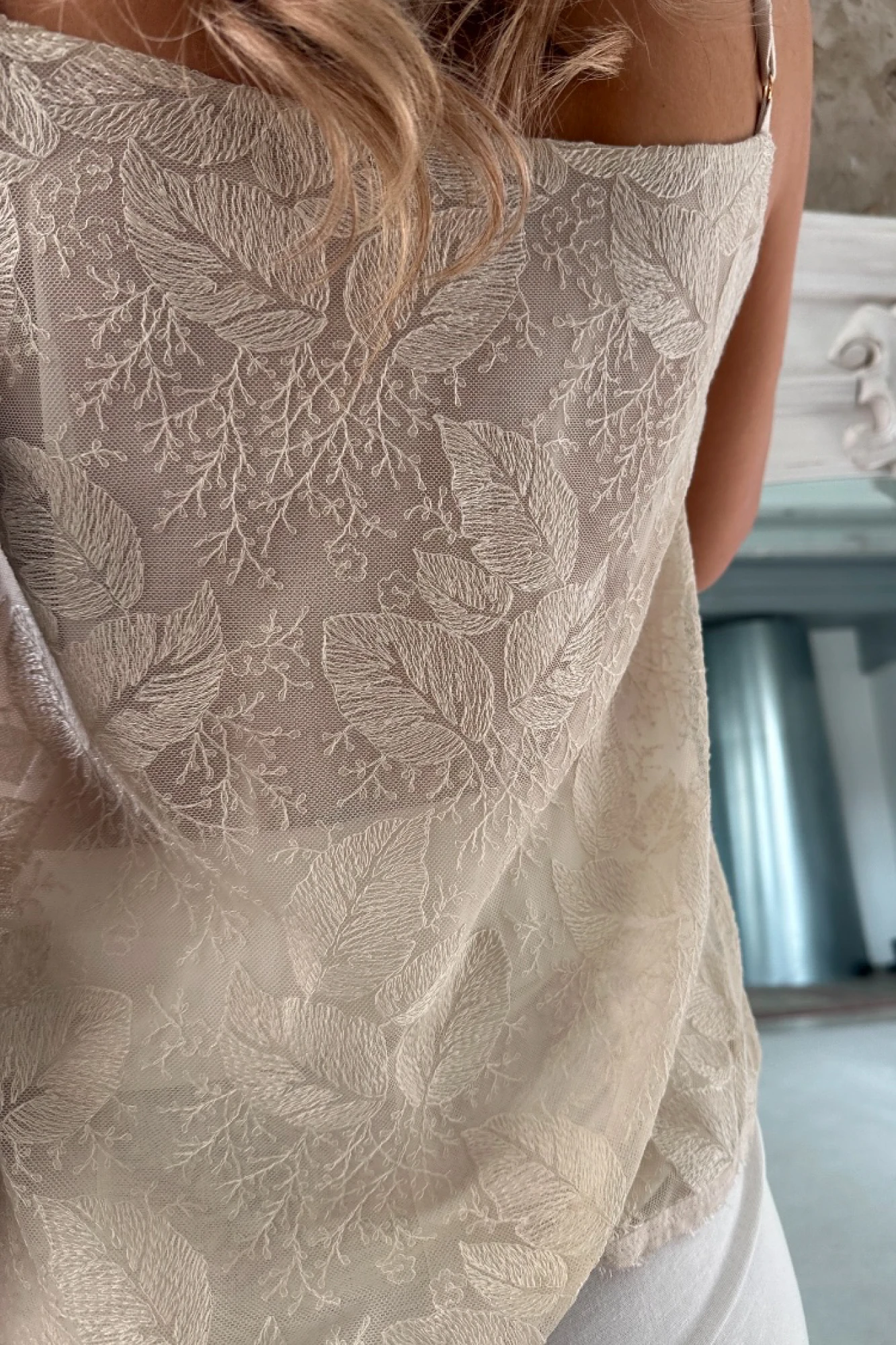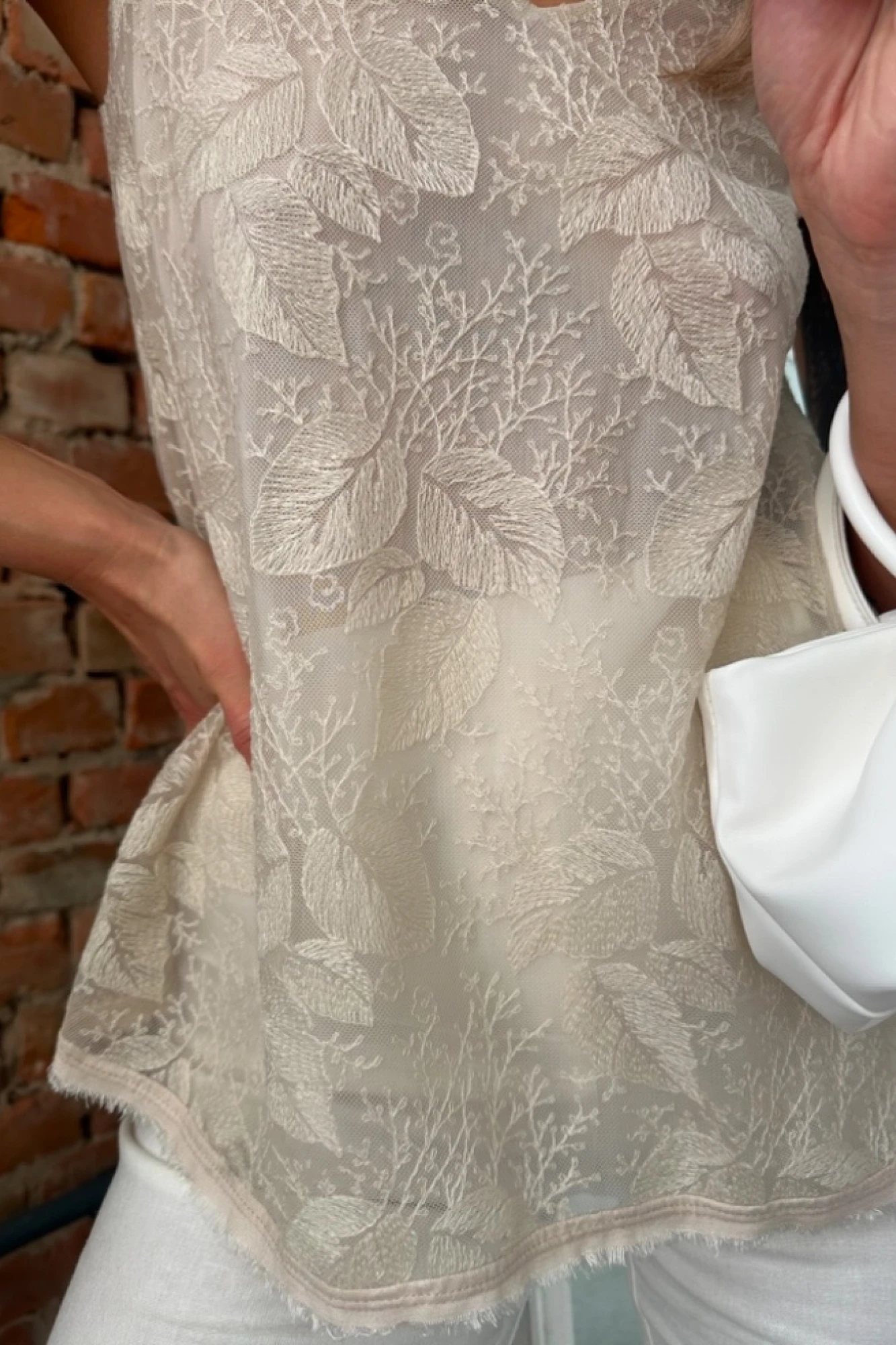 Топ на бретелях прямого силуэта на подкладке. Бретели регулируются. По низу топ украшен тесьмой.