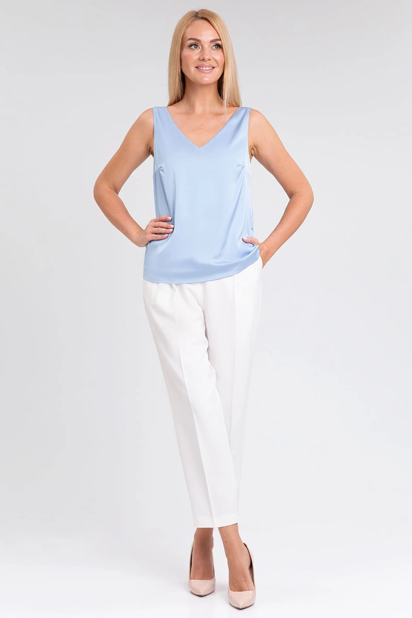Базовая блузка-топ свободного силуэта. Выполнена из полотна шелковистой фактуры с атласным блеском. V-образный вырез горловины спереди и сзади. Передняя полочка с грудными вытачками. Блузка двухслойная по переду и спинке, благодаря чему не просвечивается.