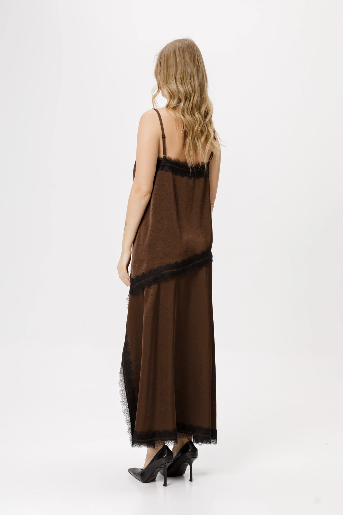 Детали: прямой силуэт, нагрудные вытачки, фигурный вырез по переду, отделка кружевом по верхнему и нижнему краю топа, регулируемые бретели.