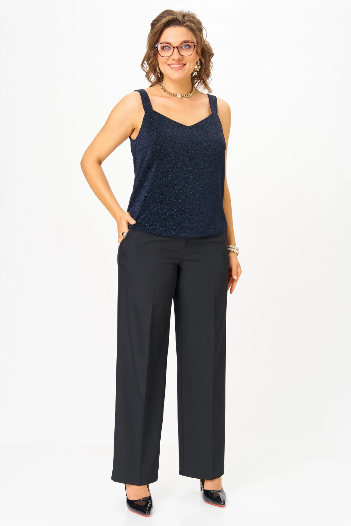 Топ прямого силуэта на широких бретелях, выполнен из трикотажного полотна с люрексом. Перед с нагрудными вытачками. Горловина переда лёгкой V-образной формы. Спинка цельнокроеная.
