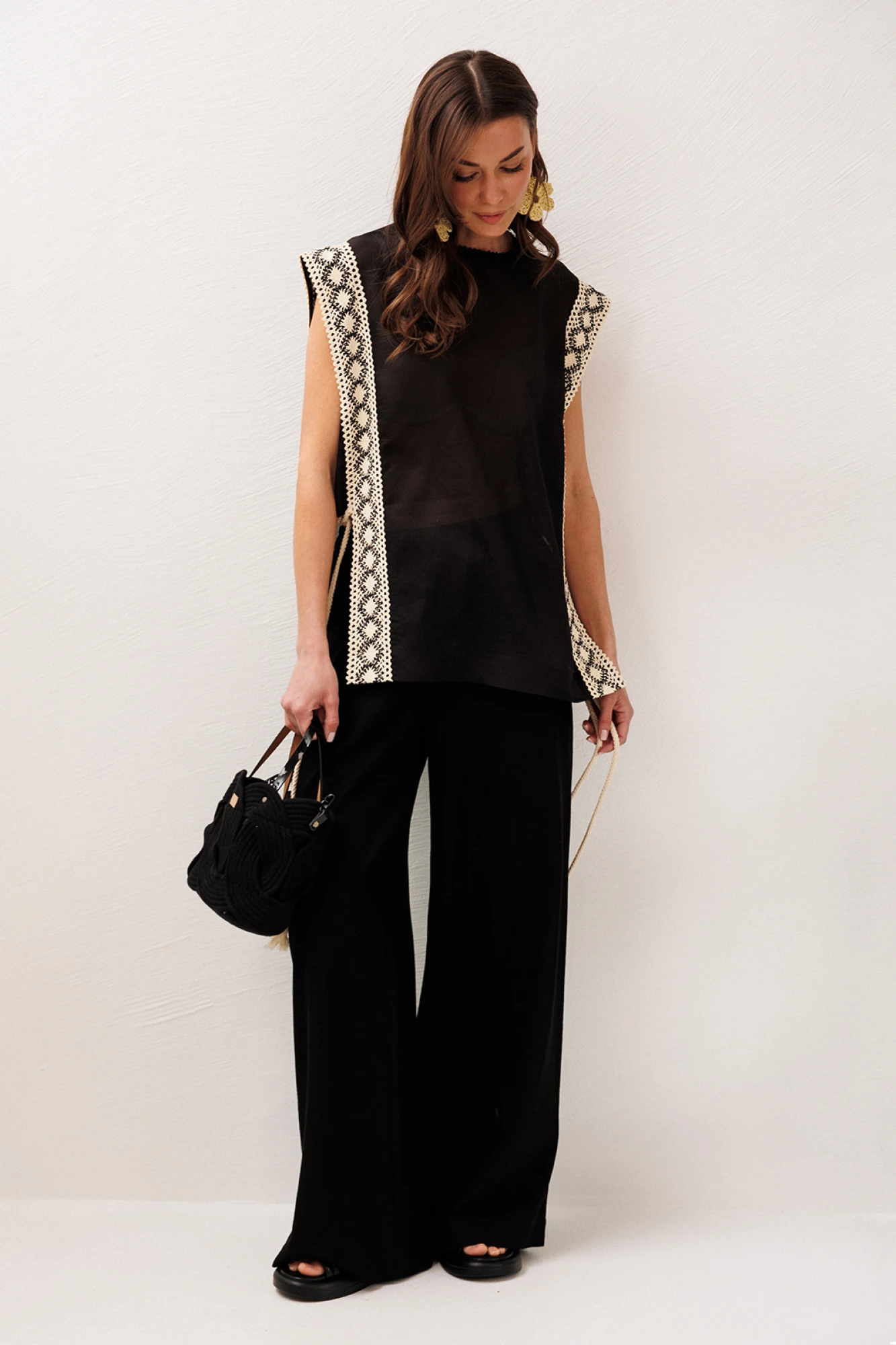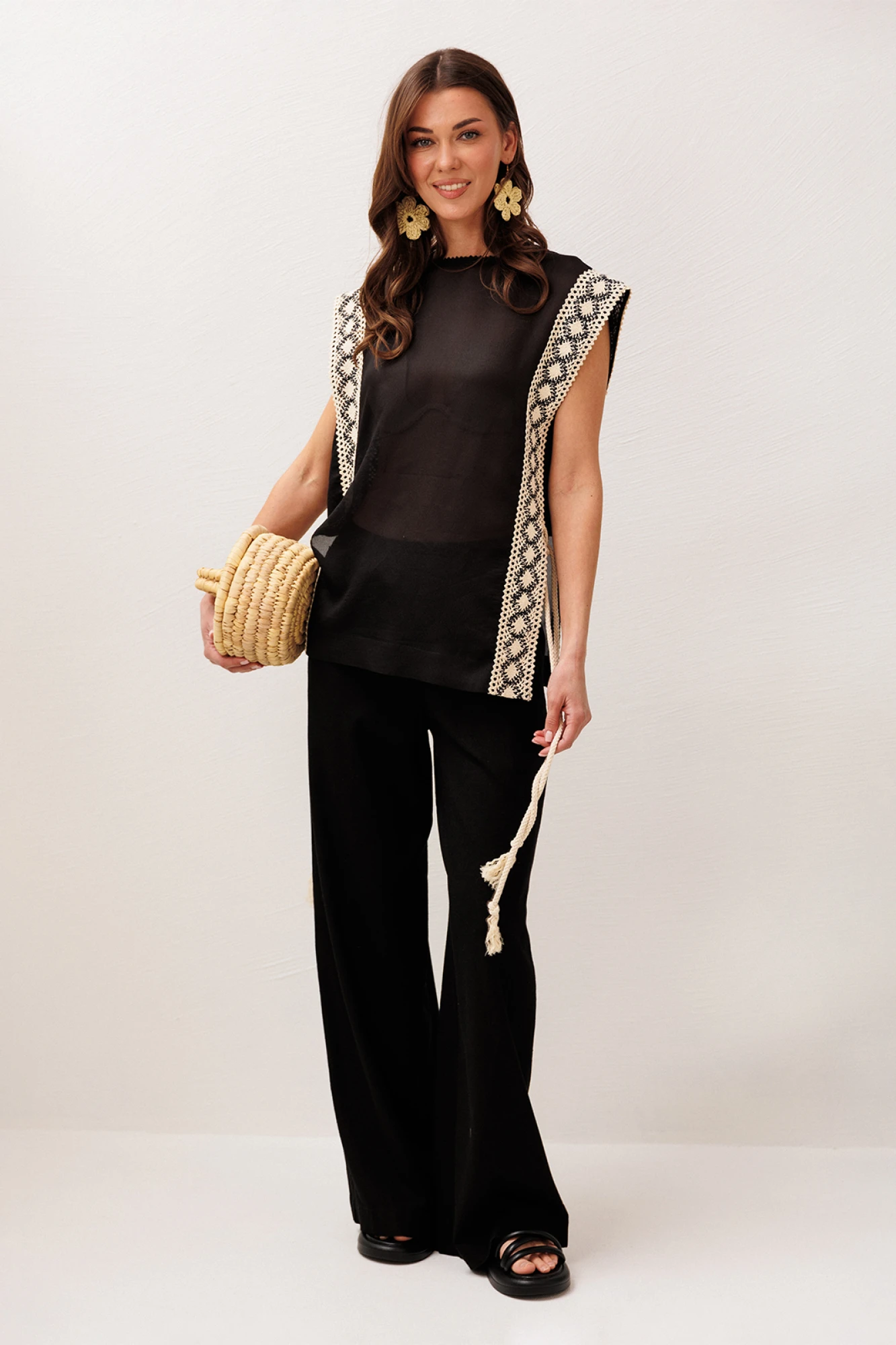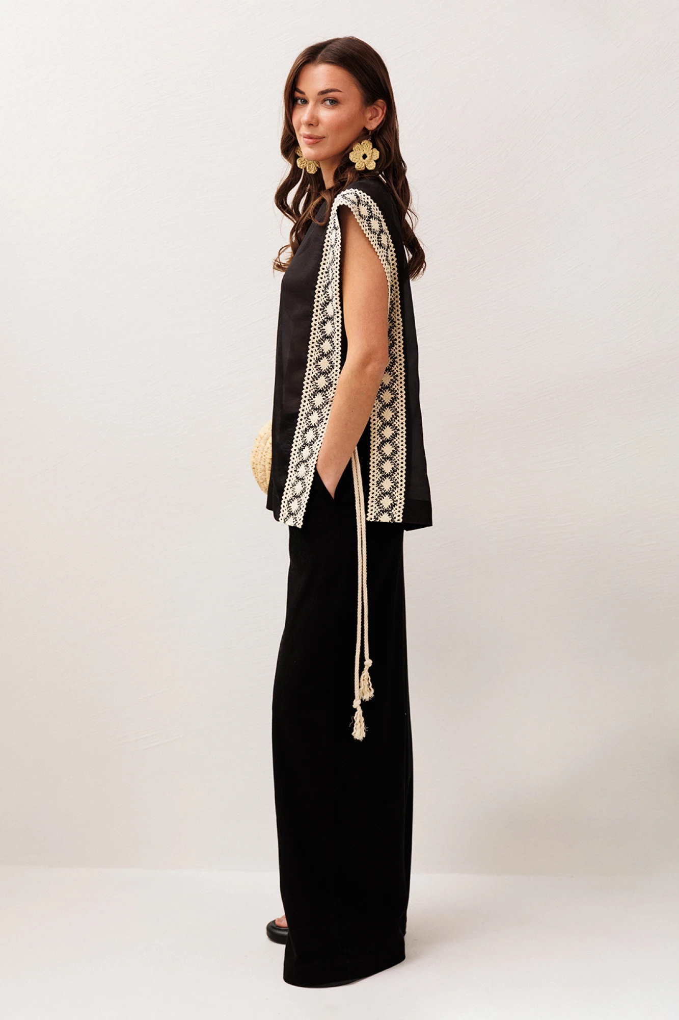 Туника из полупрозрачной ткани прямого силуэта со вставкой по бокам и завязкой на декоративный шнурок. По всей длине полочки и спинки по бокам настрочено кружево. Горловина округлая с притаченным к ней кружевом. По спинке вырез капля с застежкой на навесную петлю-пуговицу.