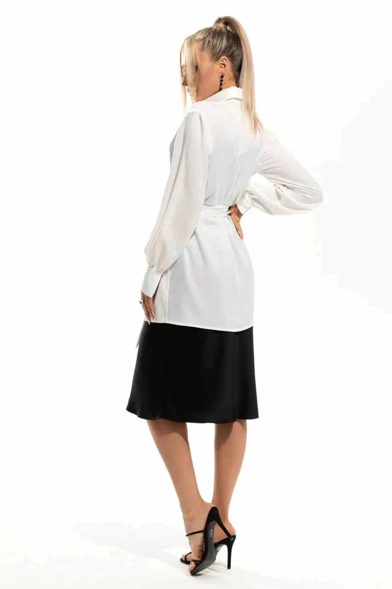 Блузка с центральной потайной застежкой на петли и пуговицы, втачным воротником с отрезной стойкой. По переду с нагрудными вытачками. Спинка цельная. Блузка со съемным поясом.