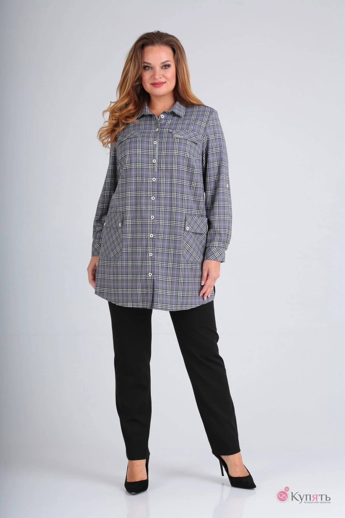 Туника женская прямого силуэта с втачными одношовными рукавами. По низу рукава притачная манжета с петлями и пуговицами. Для регулировки длины имеется пата. Перед с нагрудными вытачками, выходящими из проймы. Воротник рубашечного типа на притачной стойке. Центральная застежка-планка с петлями и пуговицами. Перед с функциональными карманами по низу и декоративными клапанами по линии груди. В швах стачивания плечевых швов – декоративная пата. Спинка цельная, с кокеткой выше линии лопаток.