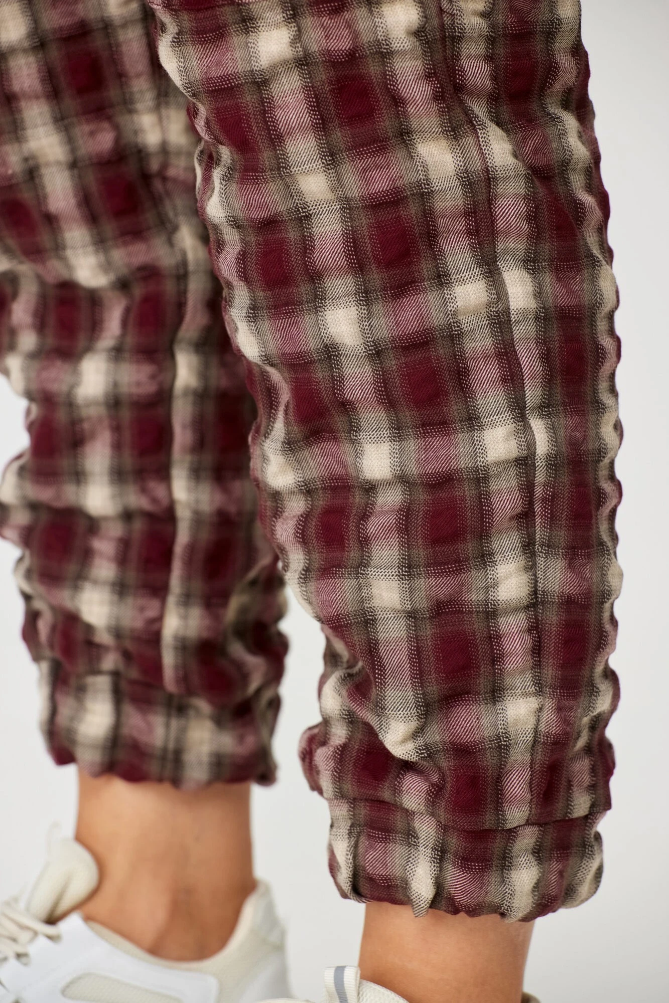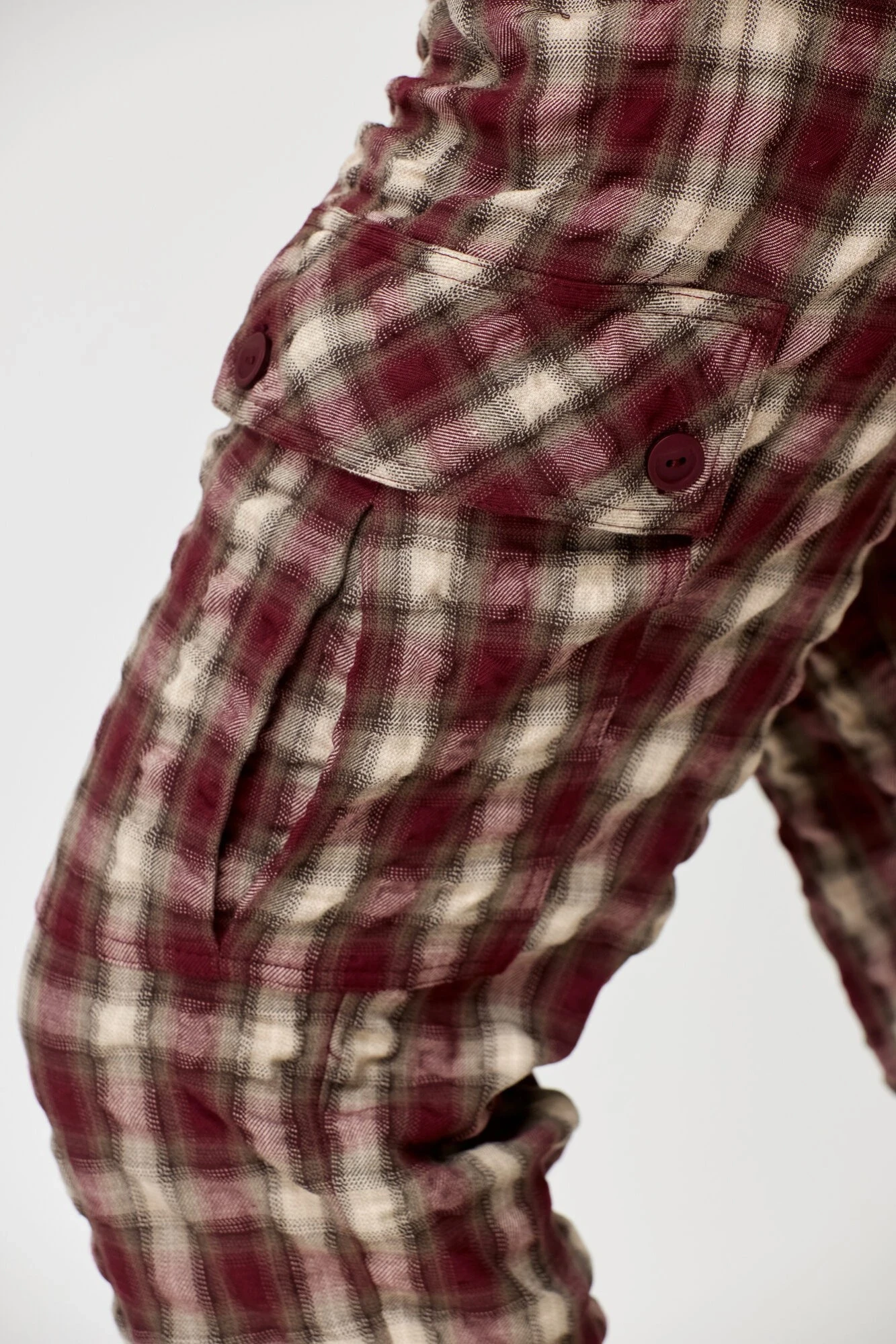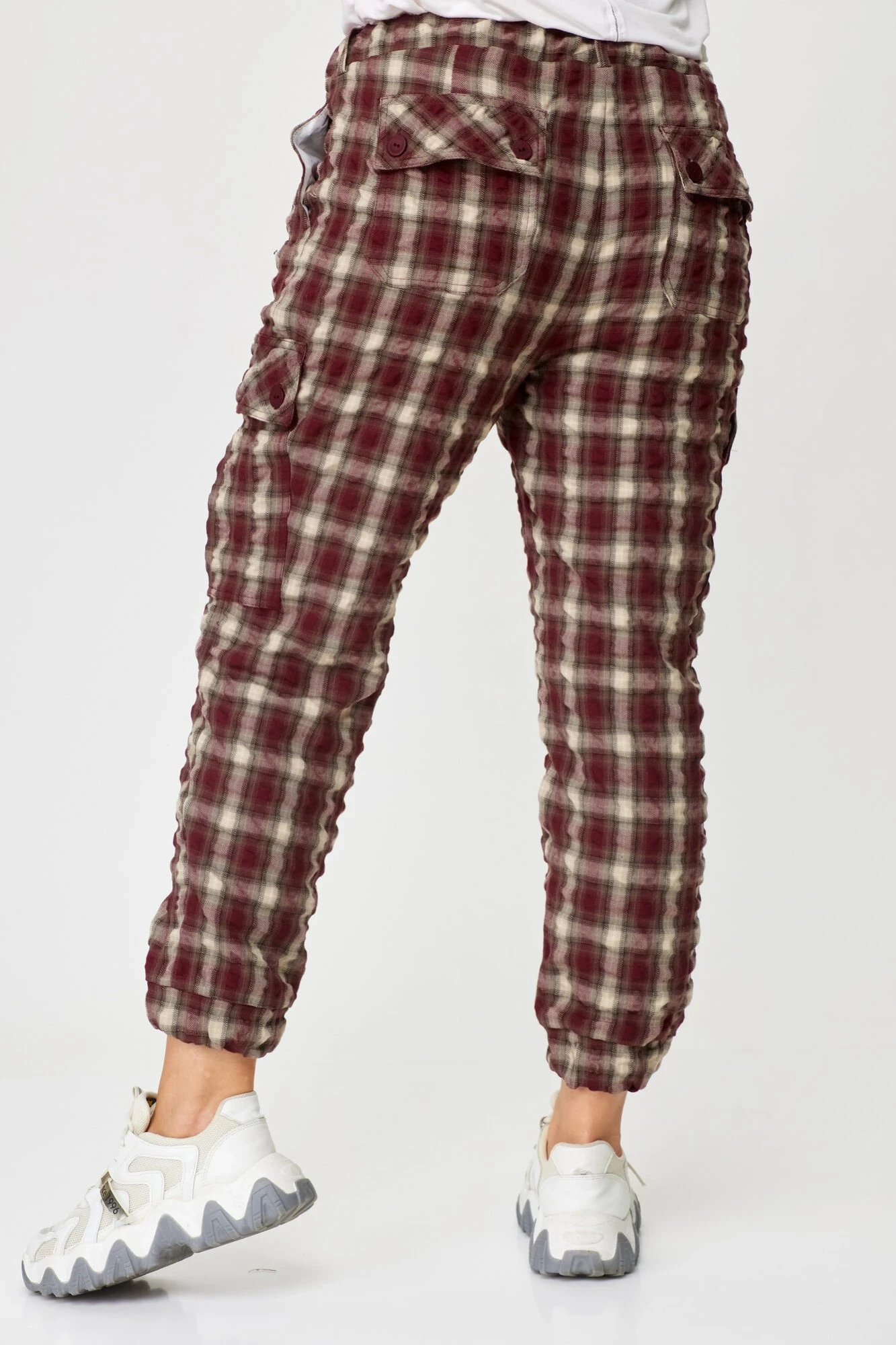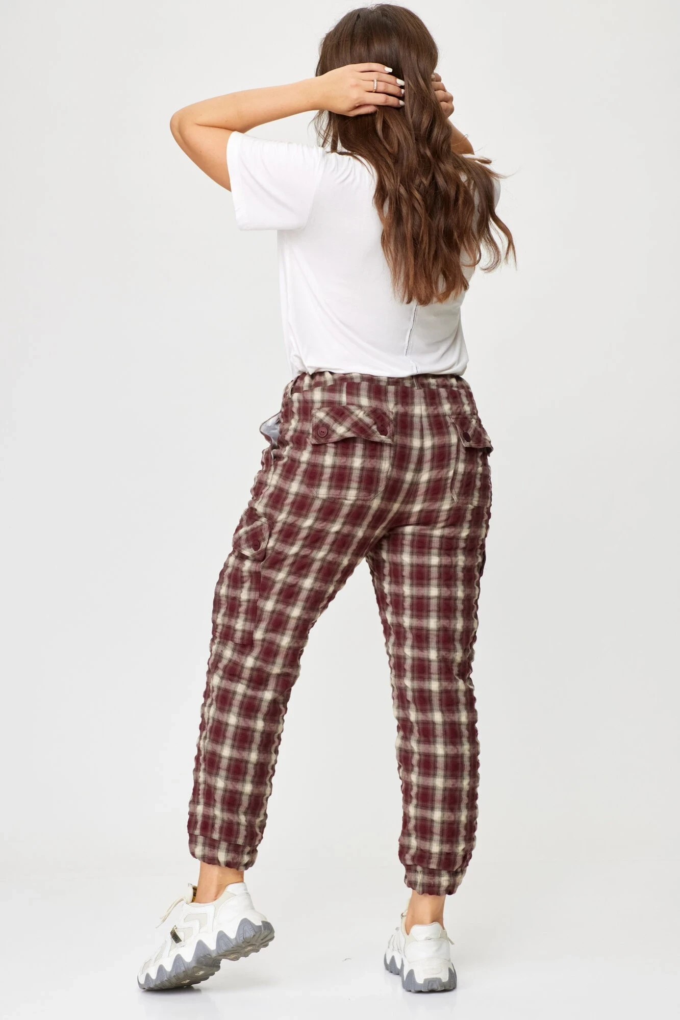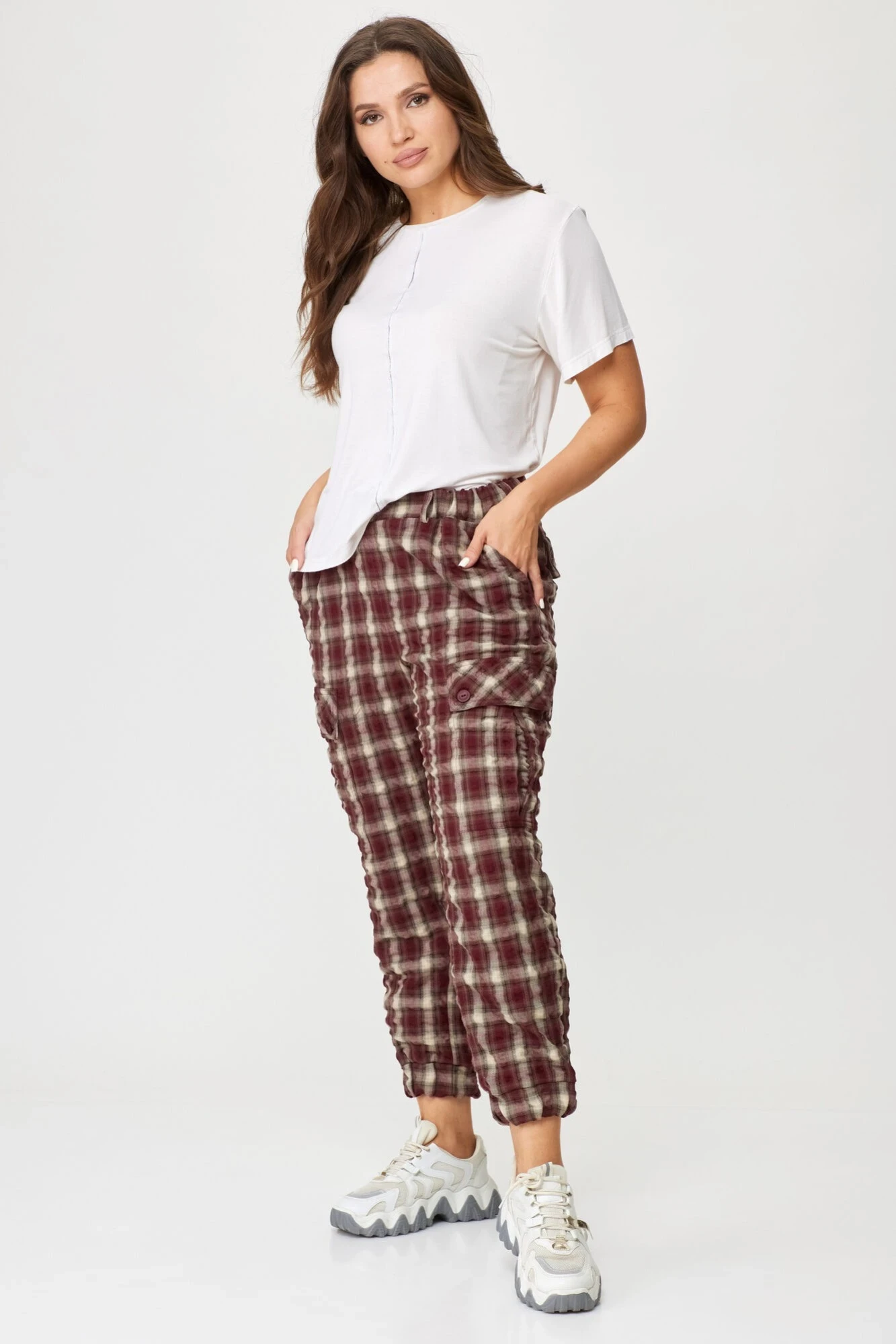 Брюки-карго представлены в двух тонах – бордо и графит. Принт – клетка.