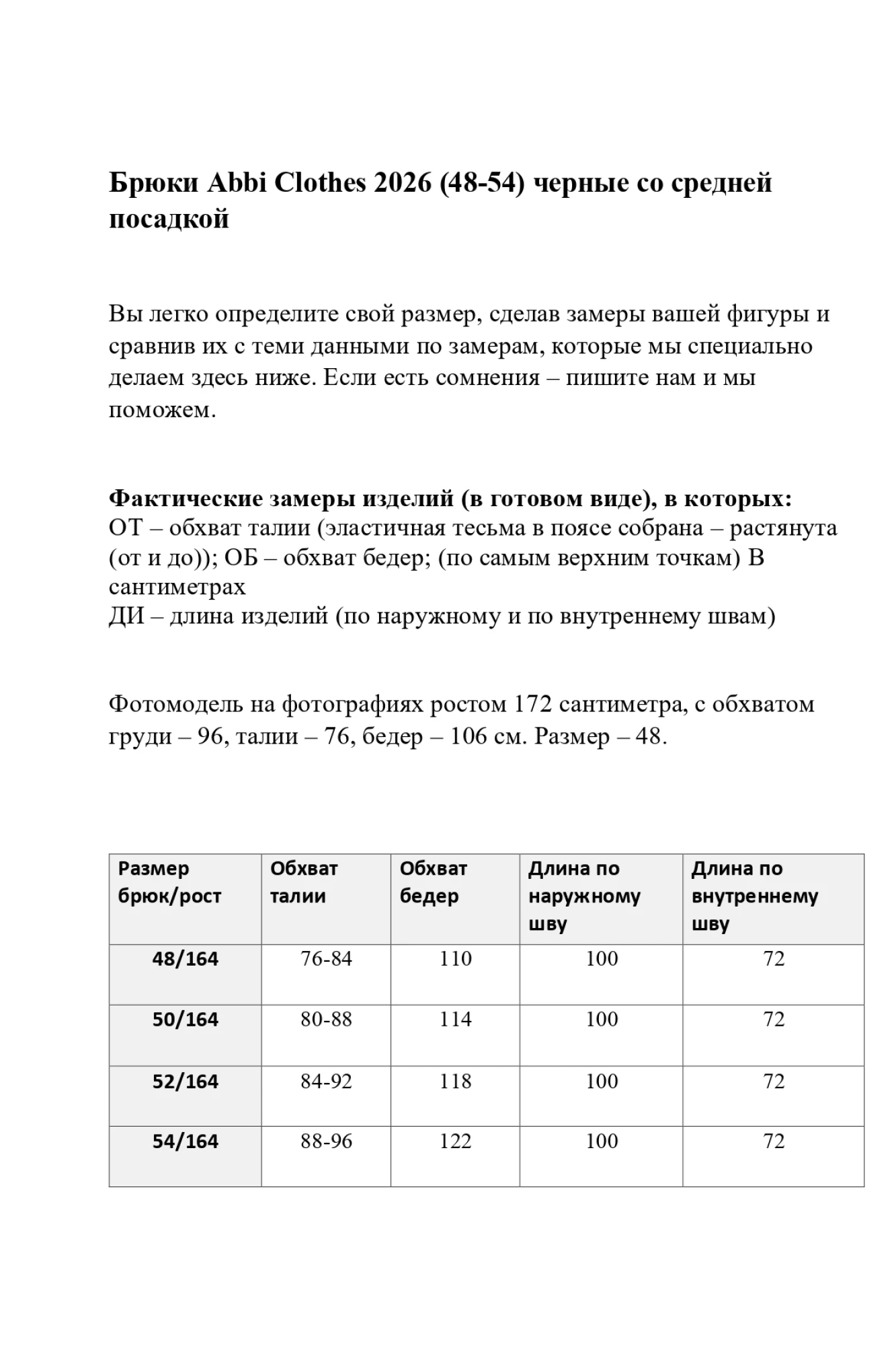 Длина брюк в размере 48 составляет 99 см. по наружному боковому шву и 73 см. по внутреннему, что делает их идеальными для различных типов фигур. В сочетании с блузой нашего бренда, которую мы использовали при съемке, эти брюки позволят вам создать безупречный образ для офиса или для особого случая.
