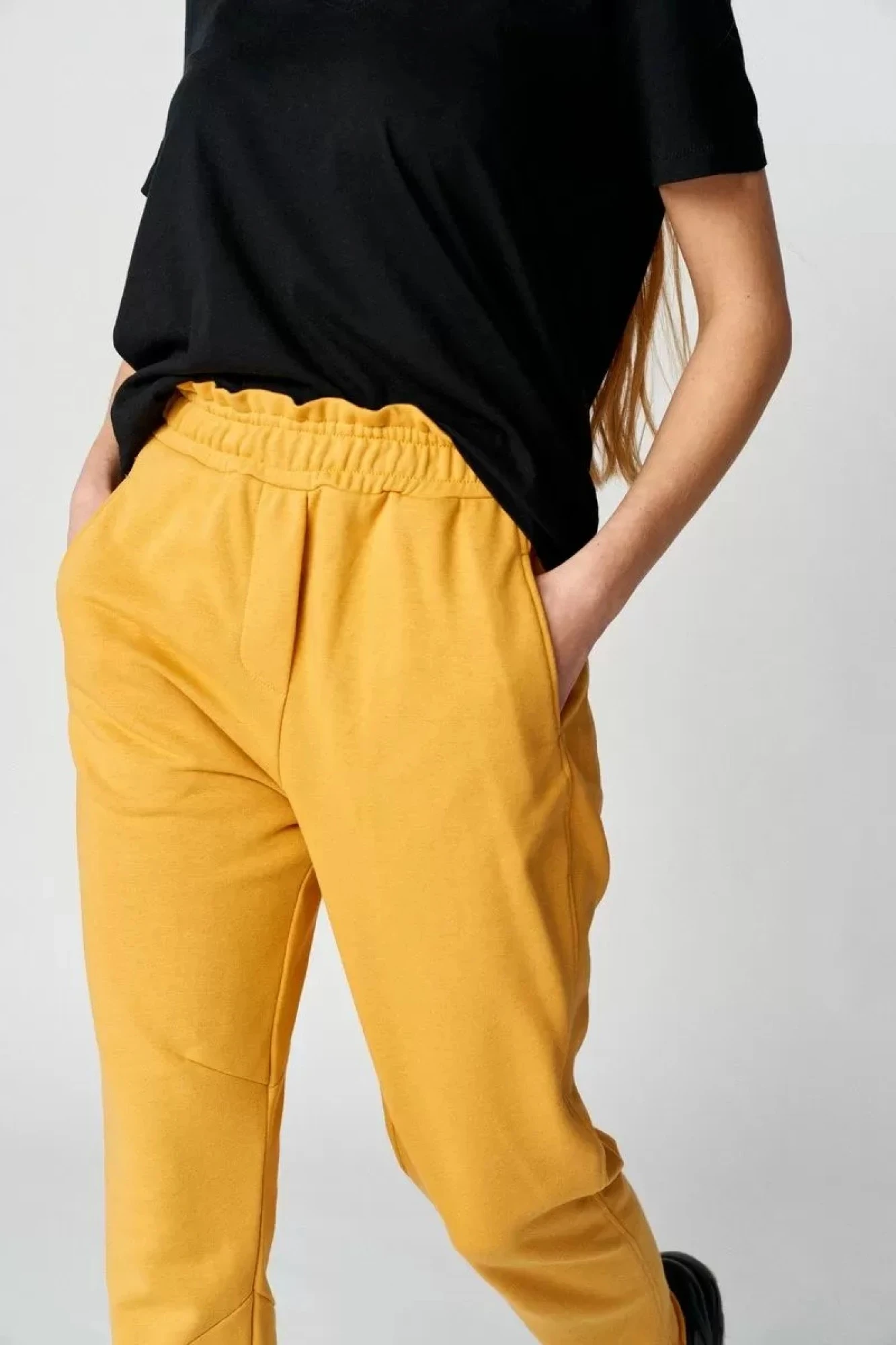 Стильные брюки свободного кроя, слегка зауженные к низу, на притачном поясе с резинкой. Брюки с высокой посадкой. По переду карманы с наклонной линией входа, сзади накладные карманы.