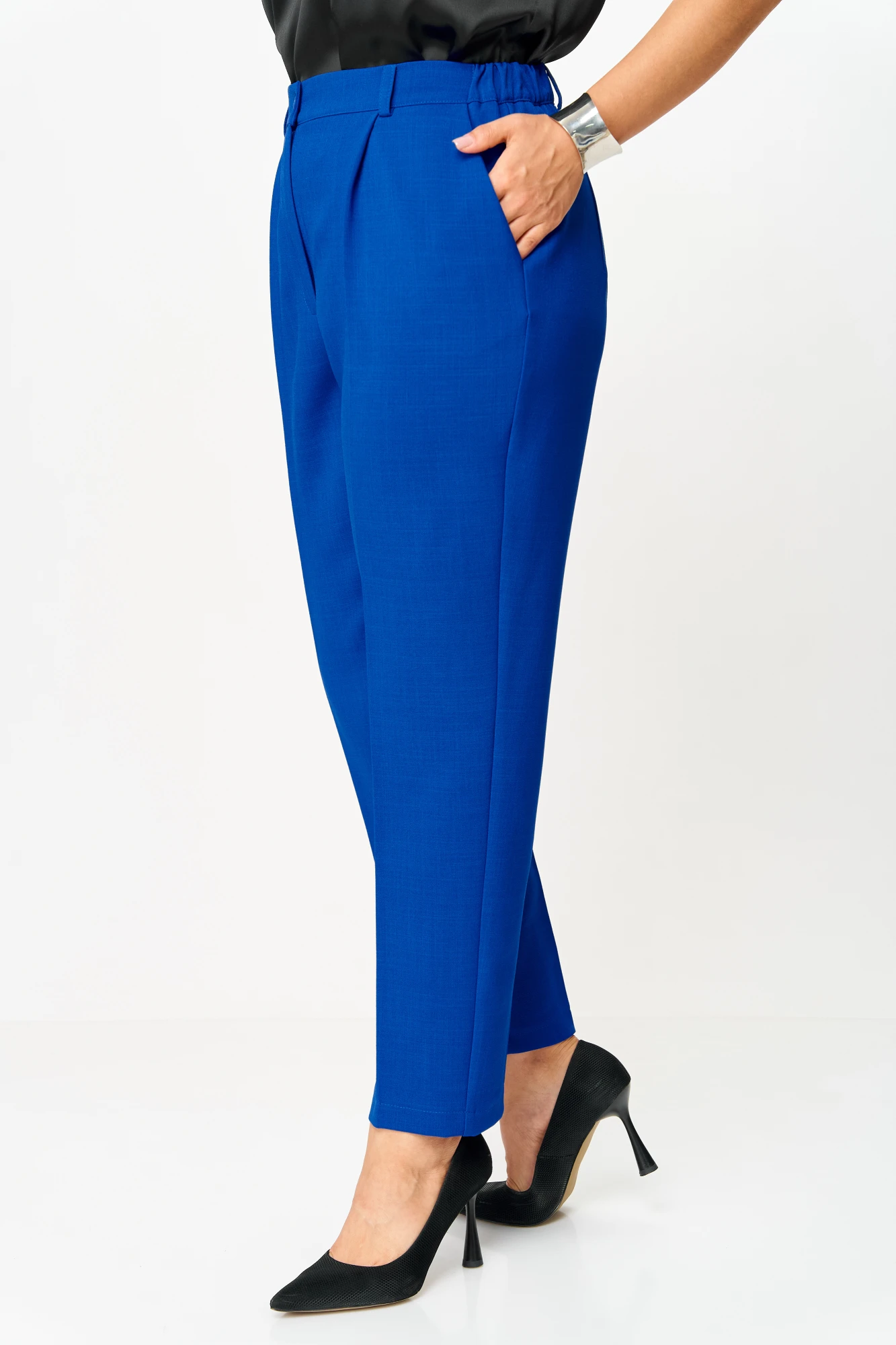 Брюки со стрелками, зауженные к низу. По передним половинкам выполнены наклонные карманы и складки по талии. По задним половинкам обработаны талиевые вытачки. В среднем шве передней половинки брюк обработана застежка на молнию. Брюки на притачном поясе с эластичной тесьмой и застежкой на петлю и пуговицу.