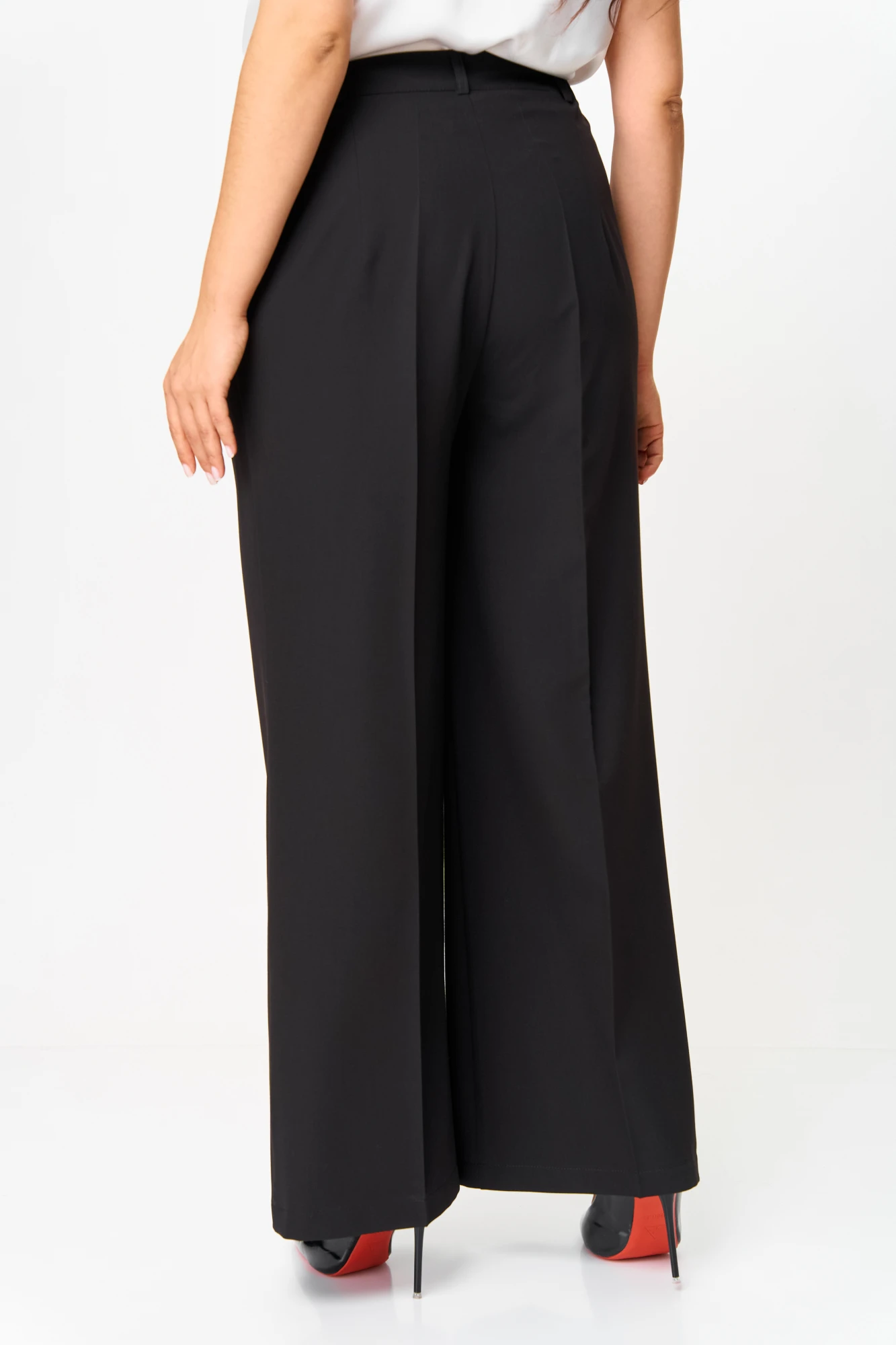 Брюки классические, со стрелками, полной длины, выполнены из однотонной ткани. В области бедер полуприлегающие, в колене и по низу прямые. По передним половинкам обработаны складки по линии талии и наклонные карманы, в среднем шве застежка на молнию. По задним половинкам обработаны талиевые вытачки. Брюки на притачном поясе с эластичной тесьмой и застежкой на петлю и пуговицу.