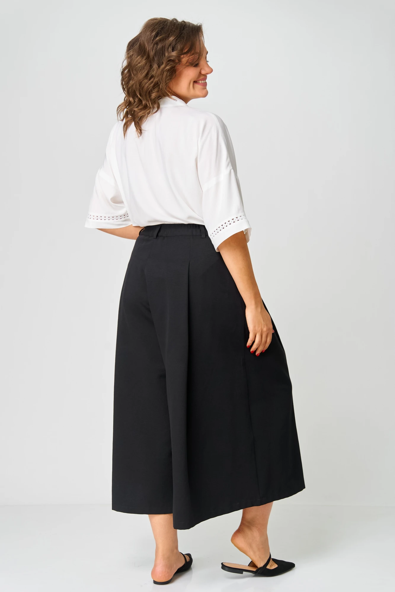 Укороченные брюки кюлоты - идеальный вариант для создания модного образа! Они прекрасно сочетаются как с деловыми жакетами, блузками, так и с повседневными вещами. Изготовленные из вискозы со льном, они приятно прилегают к телу и не сковывают движения. Высокая посадка и широкие штанины придают им оригинальности и создают впечатление изысканности. Пояс частично с резинкой, застёжка на молнию обеспечивают удобство в носке. Не упустите возможность выглядеть стильно и модно с помощью этих брюк кюлотов.