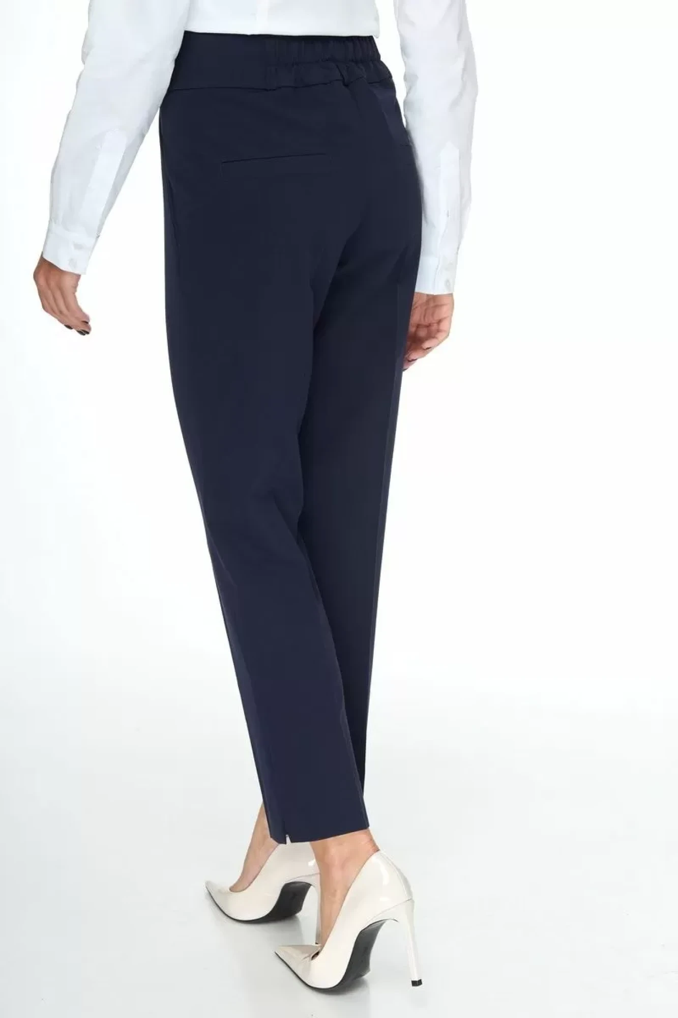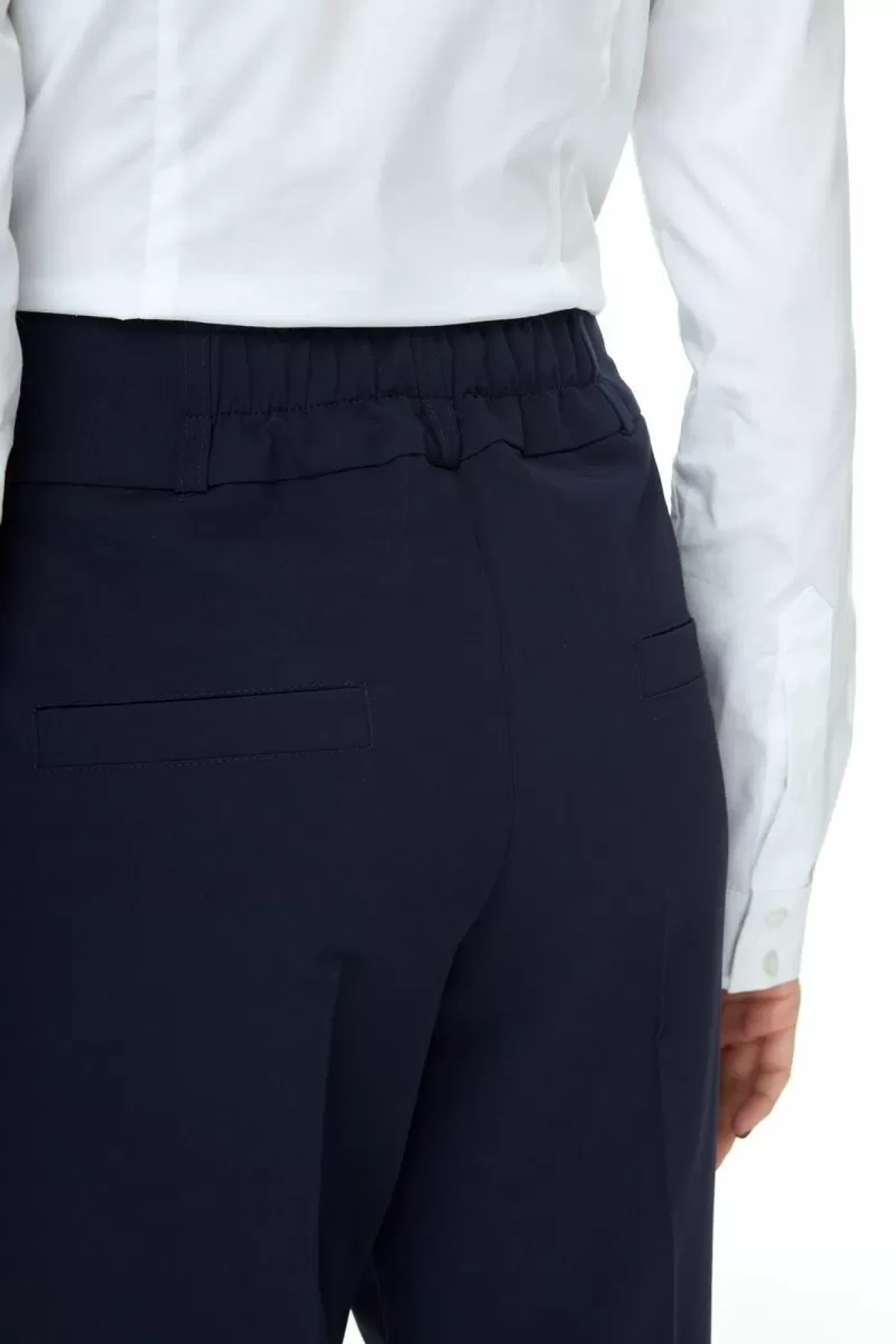 На передних половинках имитация боковых карманов делает силуэт стройнее; по низу в боковых швах разрезы.