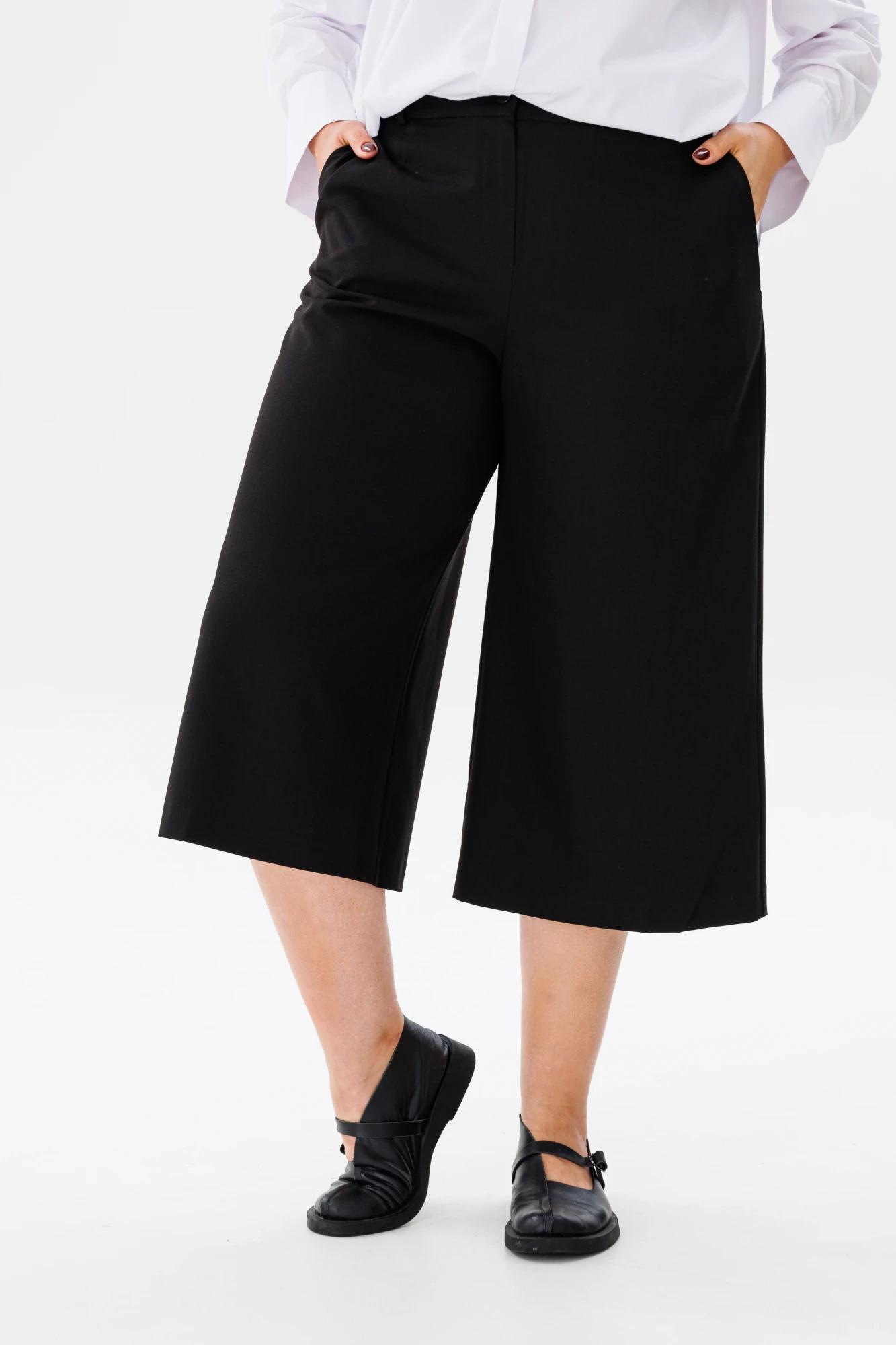 Кюлоты оснащены удобными карманами спереди и вытачками сзади для идеальной посадки. Застежка гульфик и длина до середины икры делают их практичными и модными. Они отлично смотрятся с любыми топами и блузами, помогая создать свежий и нескучный образ.