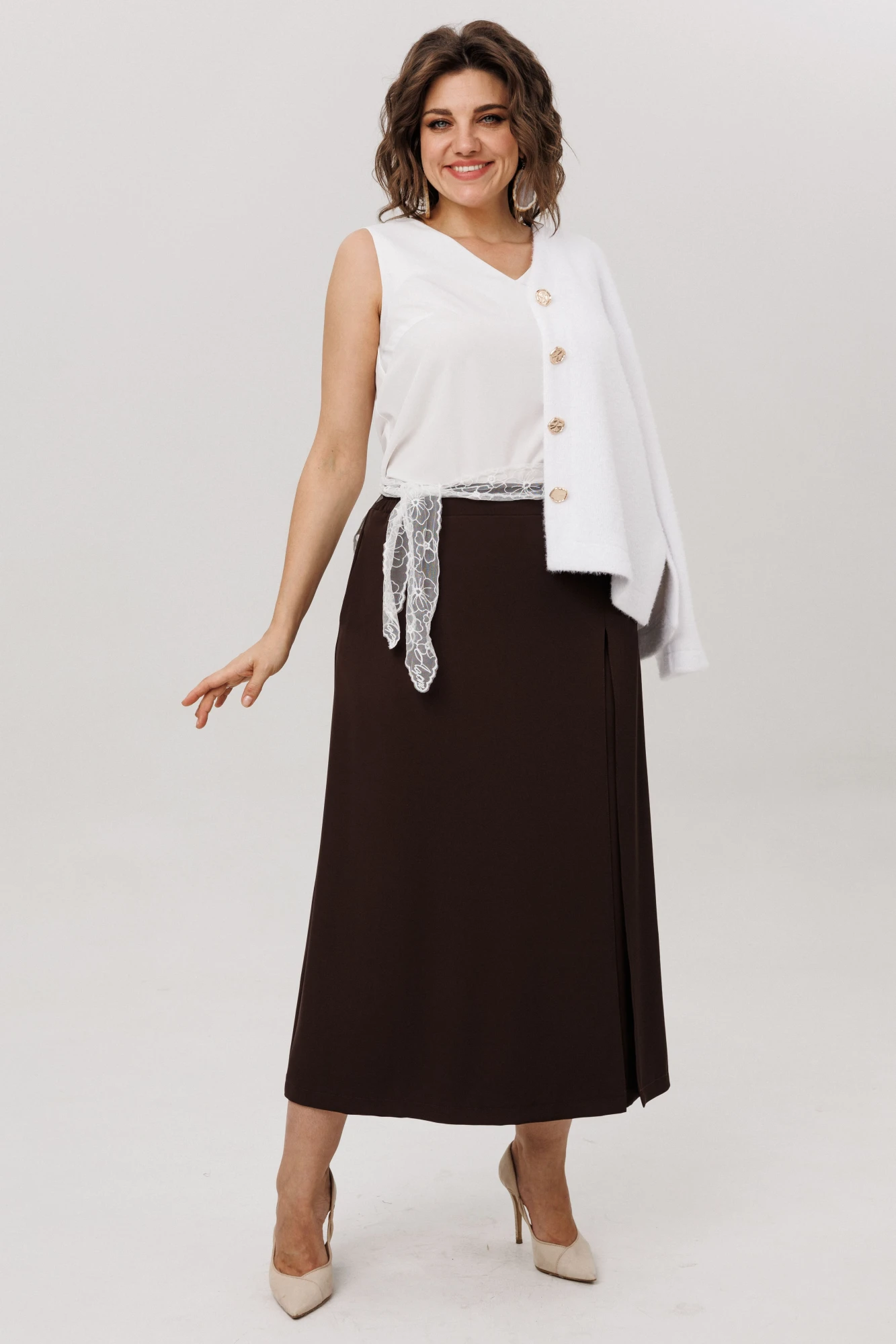 Приобрести юбку-кюлоты можно вместе с блузой в костюмах 1793 и 1793.1. Также на модели блуза в пайетки 1522, топ 1664, жакет 1661 и блуза с гипюром 1790.